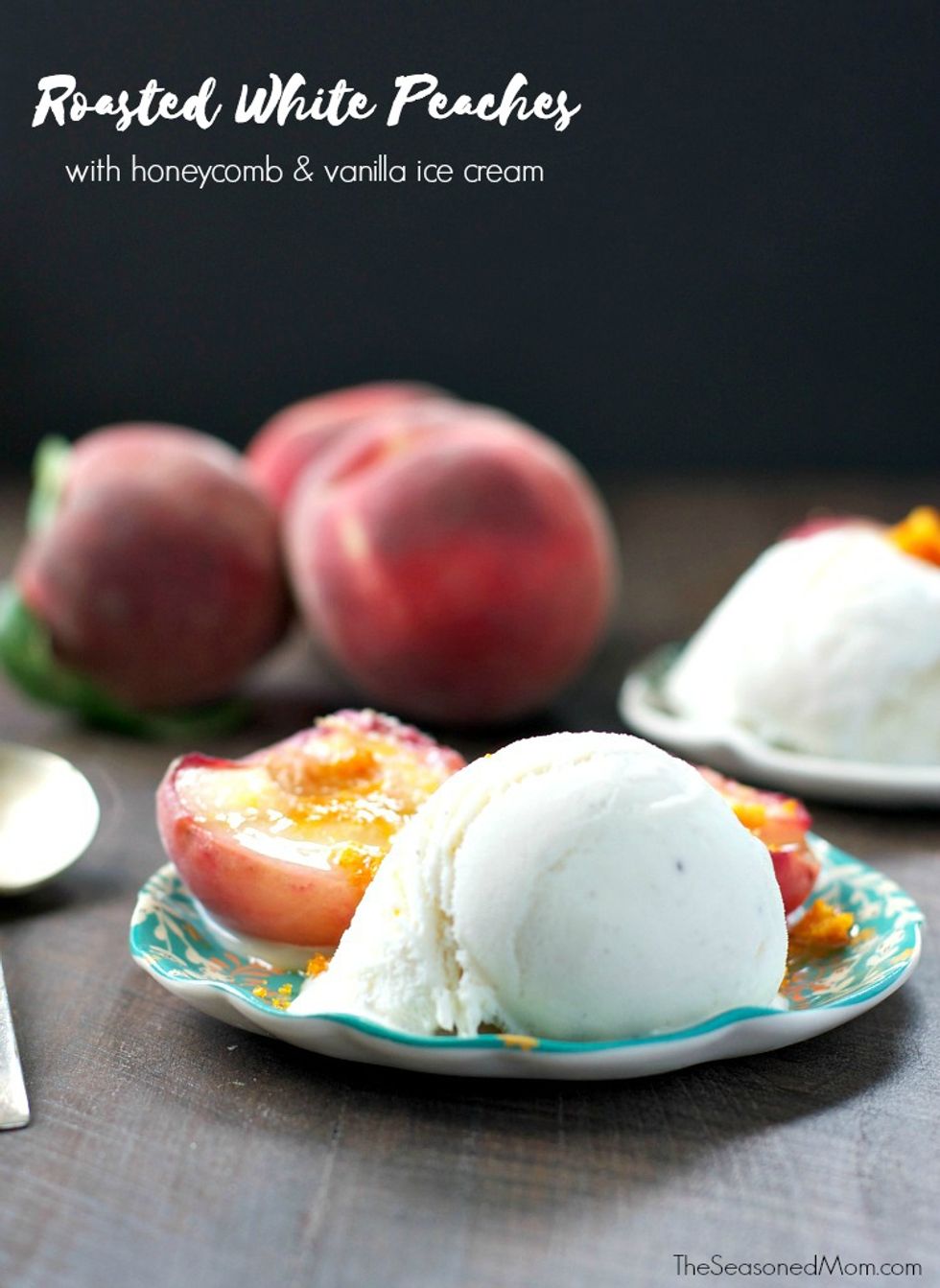 Roasted White Peaches with Honeycomb and Vanilla Ice Cream