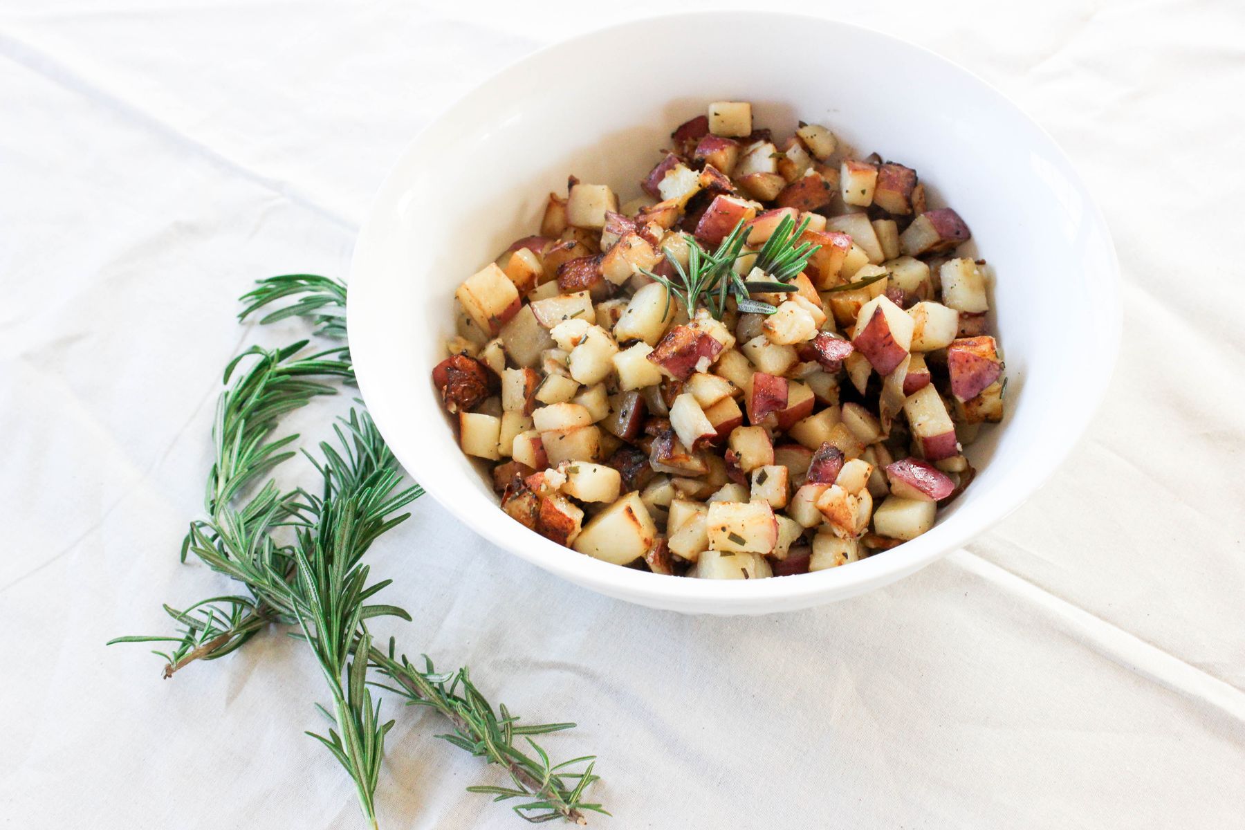 2. Add the potatoes, onion, rosemary, salt & pepper, and stir so all potatoes get coated