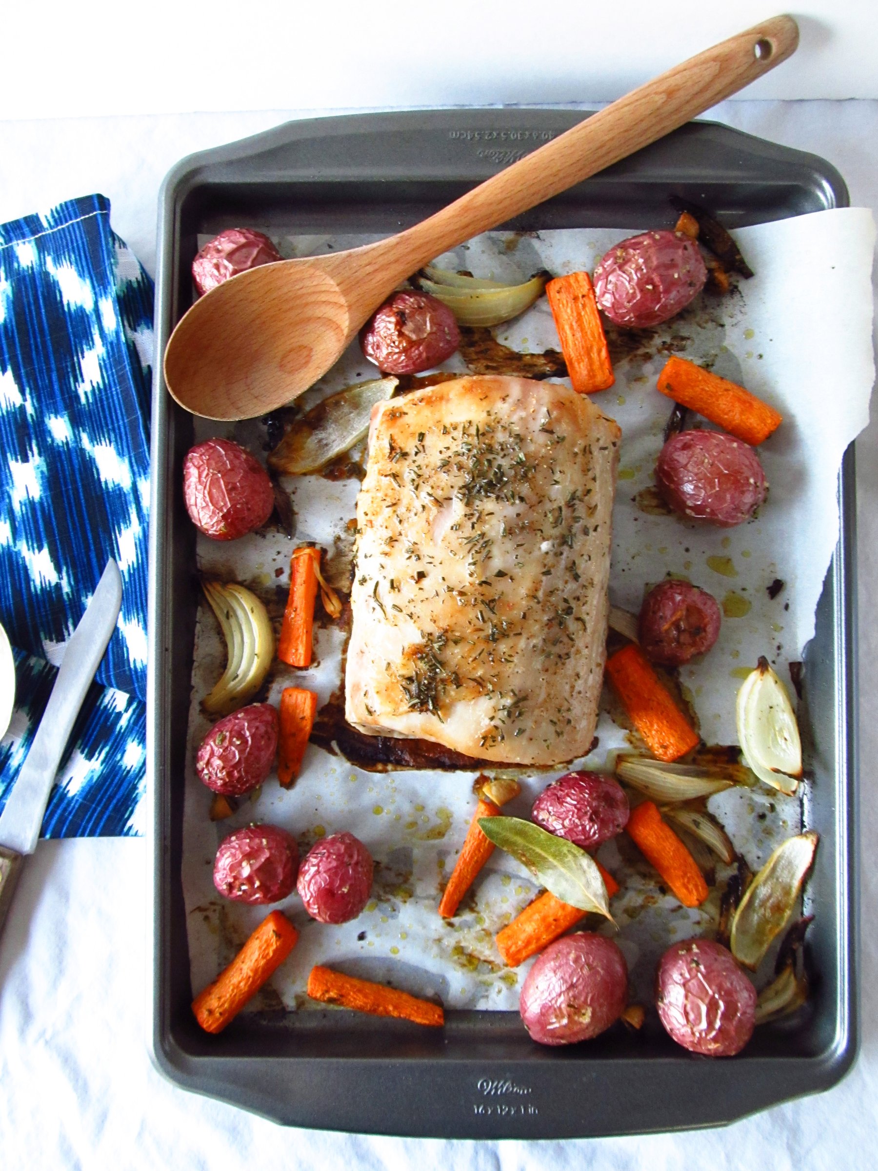A rosemary brined and roasted pork loin roast with carrots and potatoes. A savory, juicy pork loin roast perfect for a romantic dinner.