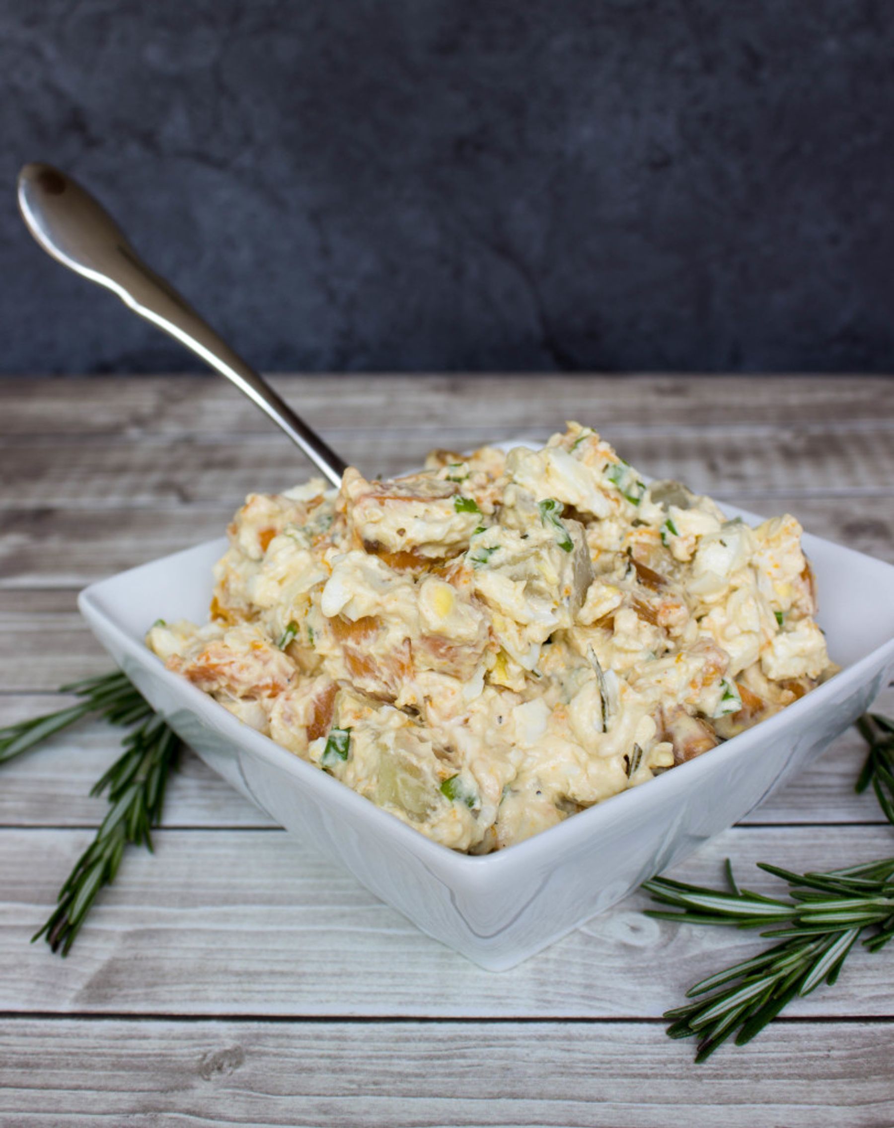 This Rosemary Roasted Sweet Potato Salad offers a unique spin on the cookout staple. Made with a scattering of white potatoes amidst sweet potatoes and accented with fresh, piney Rosemary, memories of this potato salad will linger in your memory and have you wondering what you ever saw in traditional potato salad anyway.