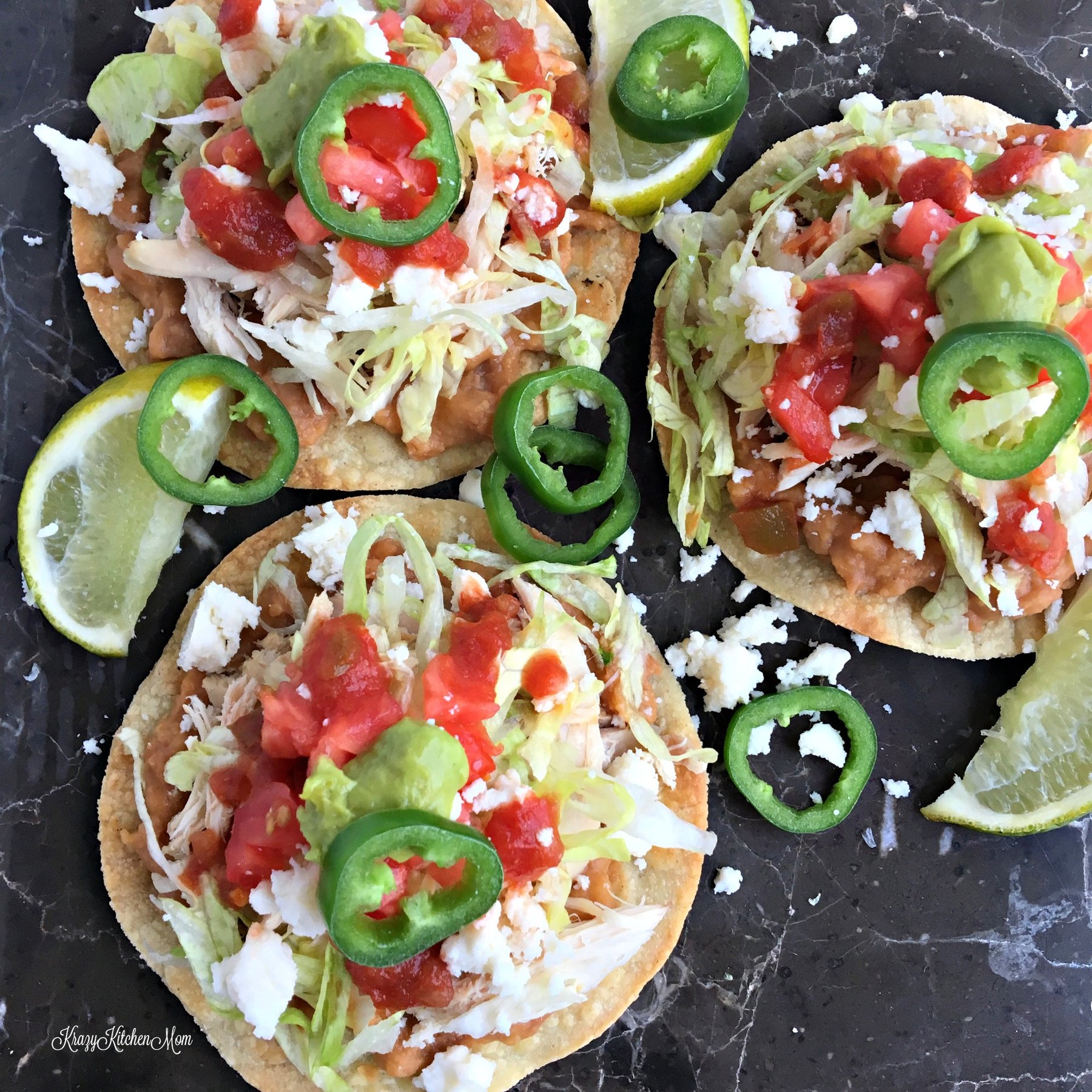Rotisserie Chicken and Bean Toastatas are an open-faced Mexican sandwich topped with beans, chicken, lettuce, tomatoes and guacamole.