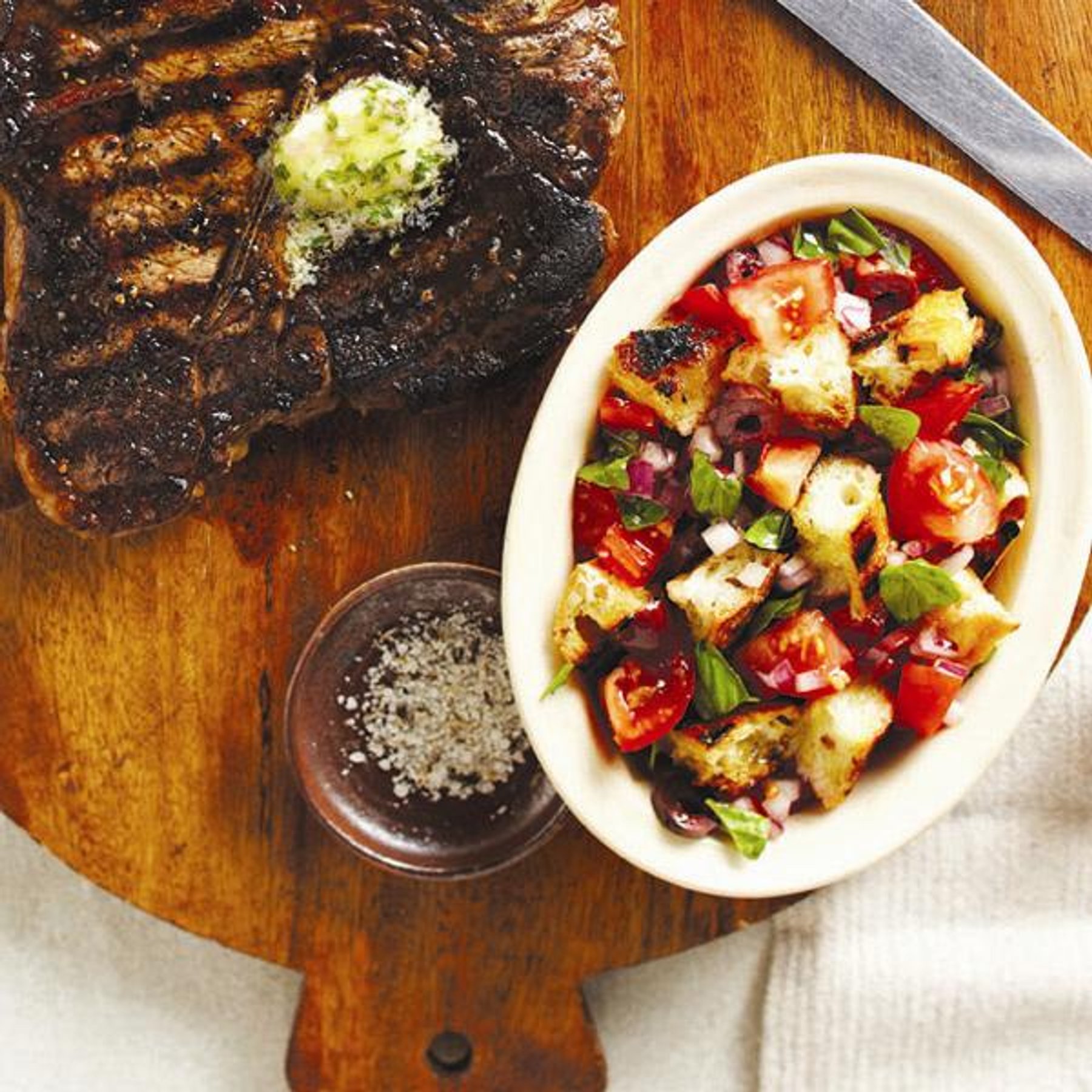 Oil grill, then toast bread, with lid open, until grill marks form, 2 min per side. Transfer to a cutting board and cut into bite-sized cubes. Stir bread along with basil into tomato mixture. Serve with Grilled t-bone with lemony maître d’ butter.