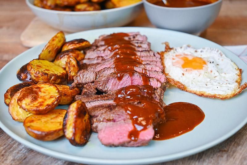 Prime beef cuts are very expensive but there are some alternatives that still deliver great results. Such as this Rump steak! To make it a full dinner, I'm serving the rump steak with a side of baked potatoes, fried egg and a lot of delicious coffee based BBQ sauce.