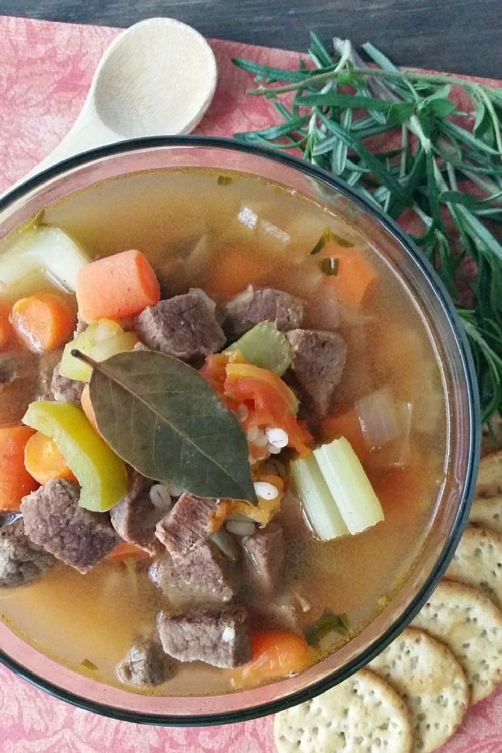 This beef barley soup is rustic and earthy with the great flavors of seasoned beef, a great mix of vegetables, nutty tasting barley, and fresh herbs. As this soup simmers it reminds me of lunch at a log cabin restaurant that I went to once. The flavors of this beef barley soup simmer together to bring you one rustic soup experience!