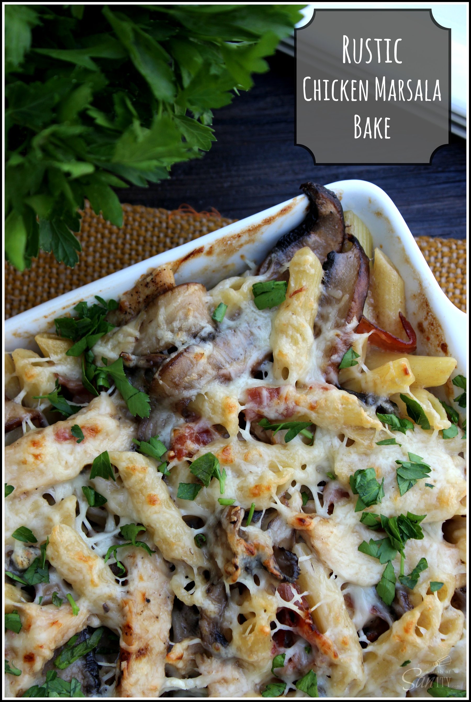 Chicken Marsala pasta bake, with a rustic twist. Made with portabella mushrooms, penne pasta and marsala wine cream sauce.