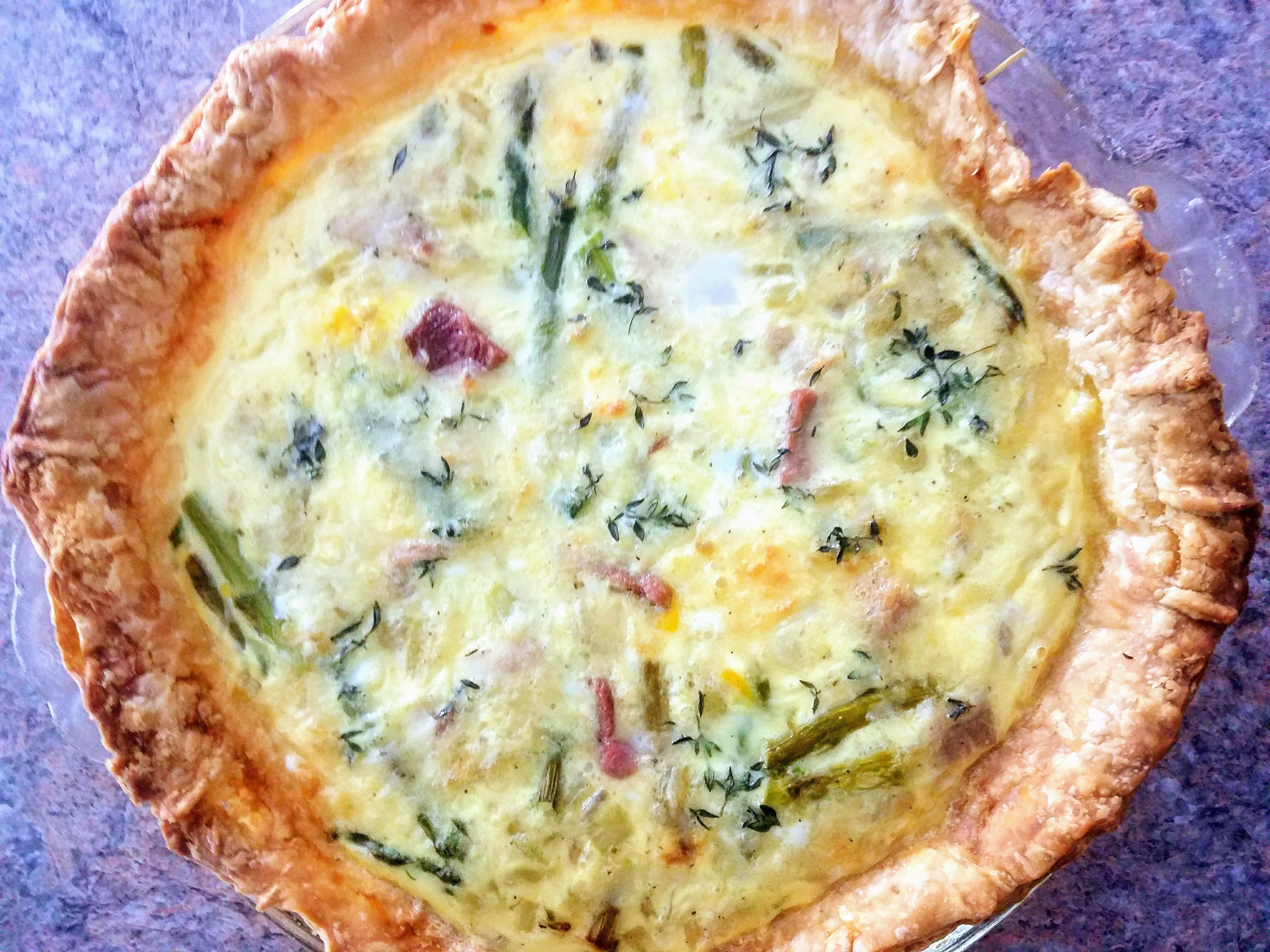 Rustic Quiche with ham, asparagus, onion, shredded cheddar cheese and fresh thyme. Easy, filling, and convenient to transport this quiche is perfect to bring to work during the week and it's a crowd pleaser for weekend brunch. Visit http://ashleyspaige.com/rustic-ham-asparagus-quiche/ for full recipe!