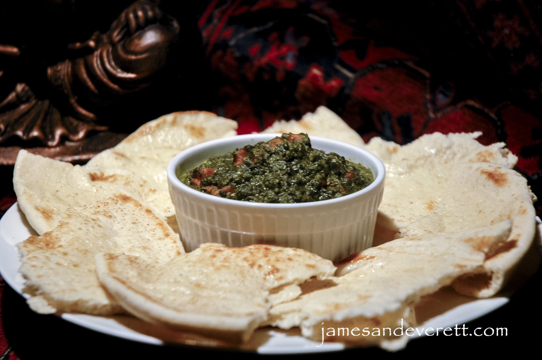 A delicious creamy spinach dish with bits of paneer commonly served with naan bread as a dip.