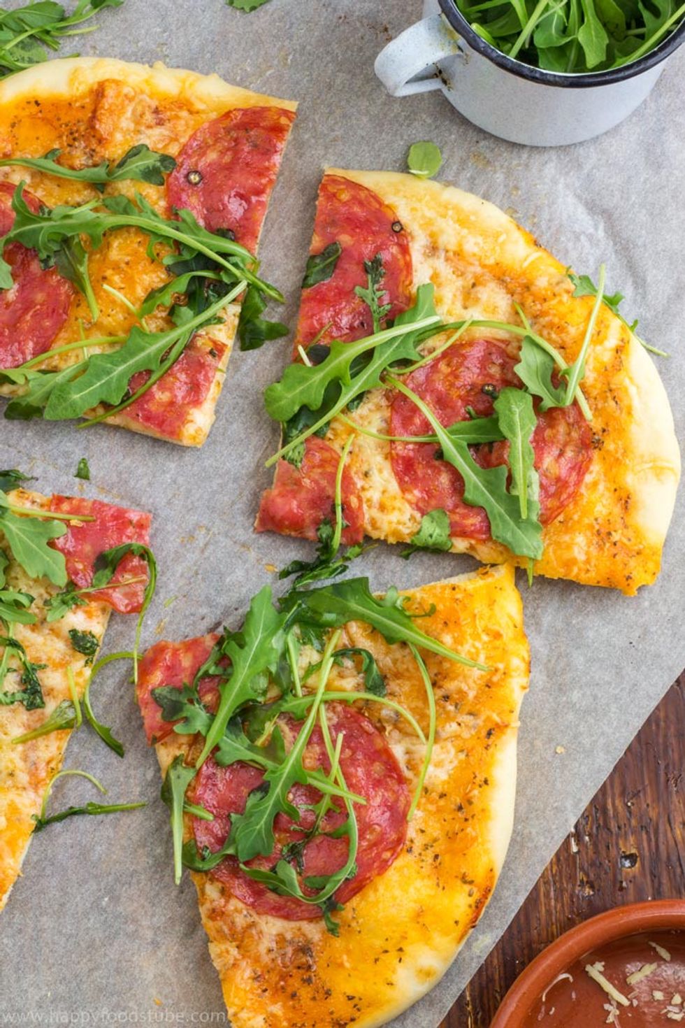 Pizza time! Salami pizza with cheese and arugula is waiting for you!