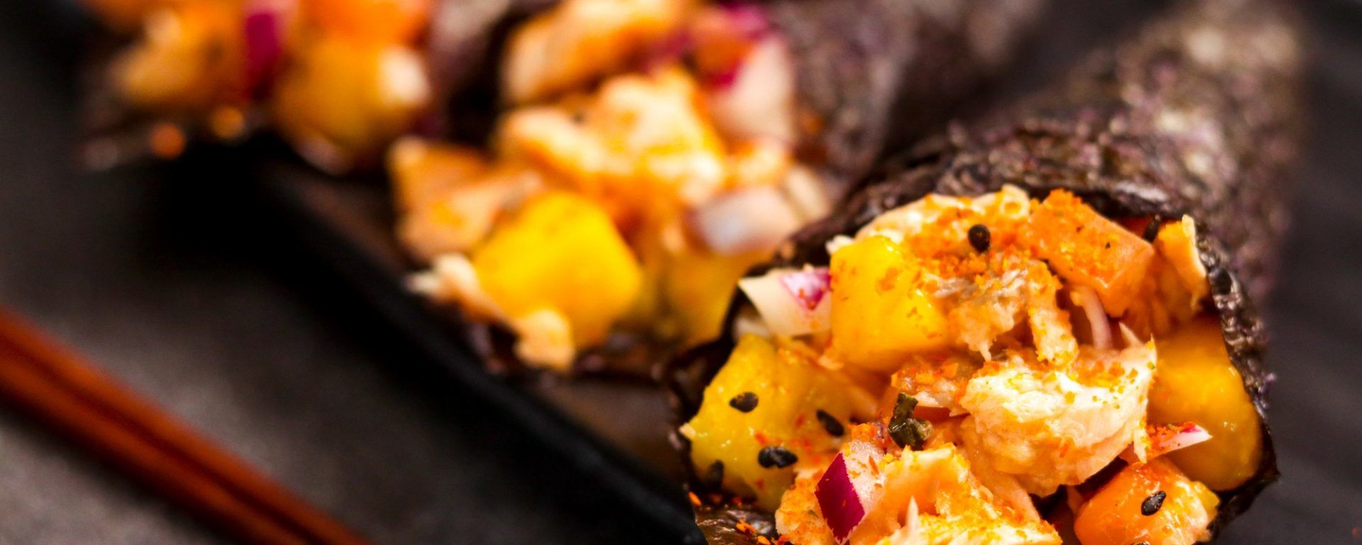 Thanks to the ancient Japanese tradition, today we present our own delicious version of the wrap recipe. Though it doesn't contain rice and isn't intended for a long journey, it still offers a range of nutritional benefits and has a fantastic flavour due to the original togarashi spice mix. So the salmon provides energy-boosting creatine and DHA, an essential omega-3 acid which helps to prevent brain and heart related diseases. Tomatoes are full of potassium, vitamin A, C and phytochemical lycopene. The latter has been recently found to reduce risk of cardiovascular diseases and prostate cancer as well. In one recent study mango was shown to have multifaceted positive effects like anti-inflammatory, anticancer, antioxidant and even more health-enhancing ones. Hence it's highly recommended for inclusion in a common diet.