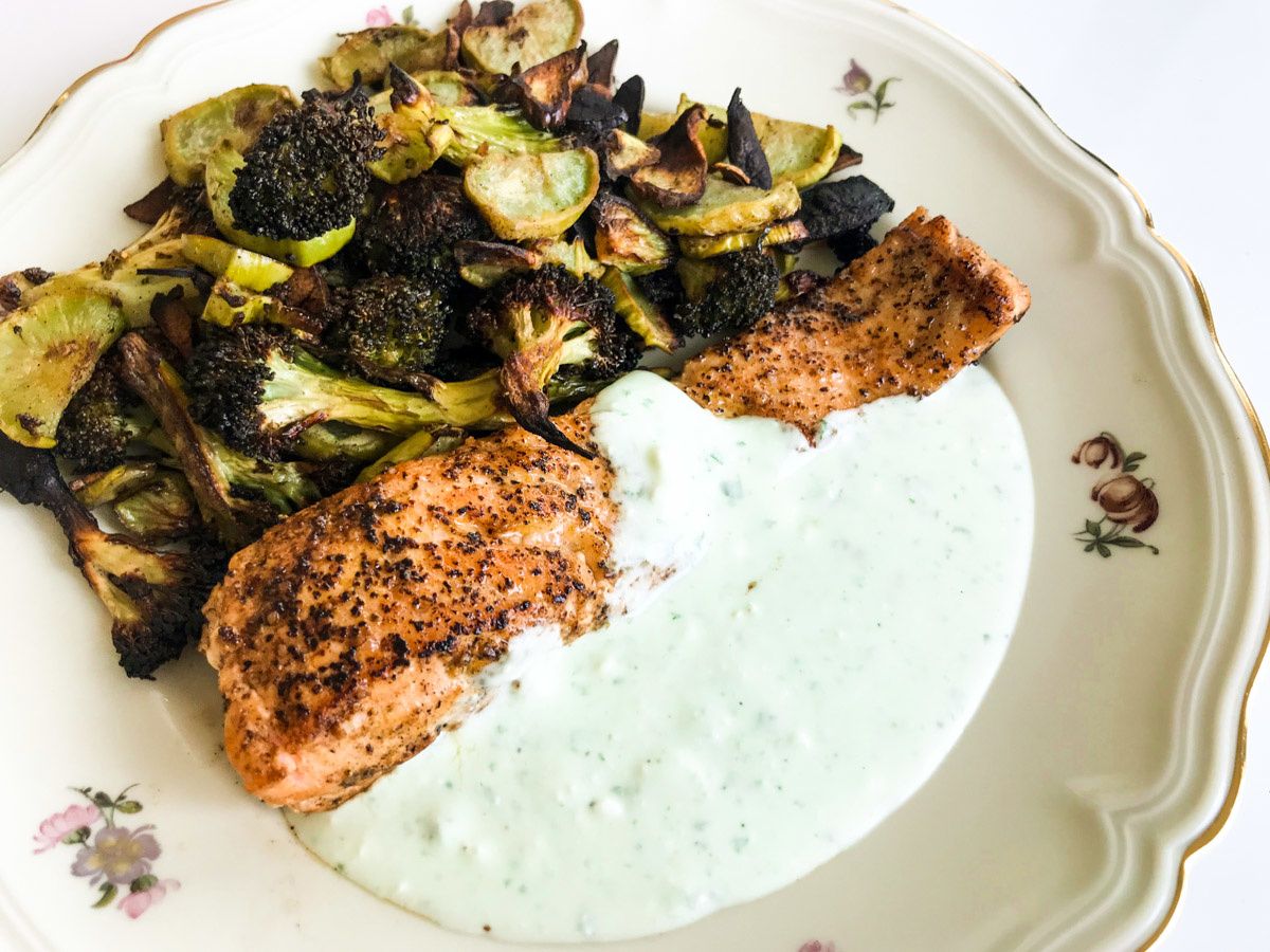 Salmon with Garlic Roasted Broccoli & Feta Sauce
