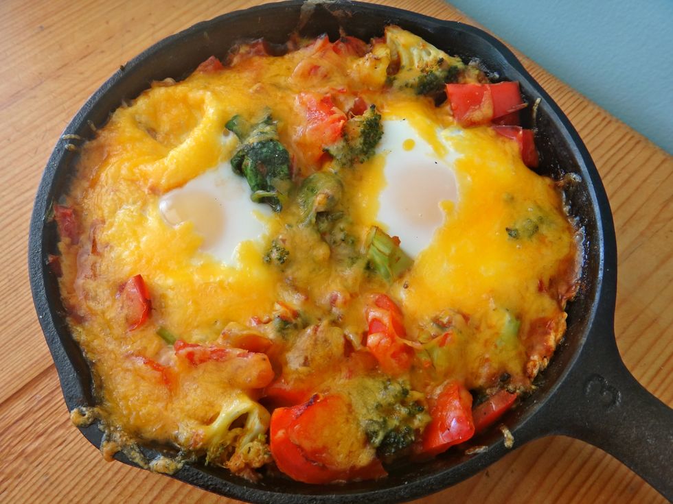 I loaded this little skillet with fresh veggies, all natural salsa, 2 farm fresh eggs and cheddar cheese. It's delicious and so filling!