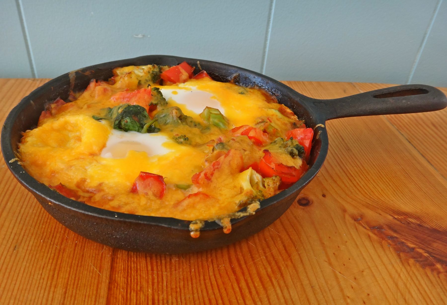 I loaded this little skillet with fresh veggies, all natural salsa, 2 farm fresh eggs and cheddar cheese. It's delicious and so filling!