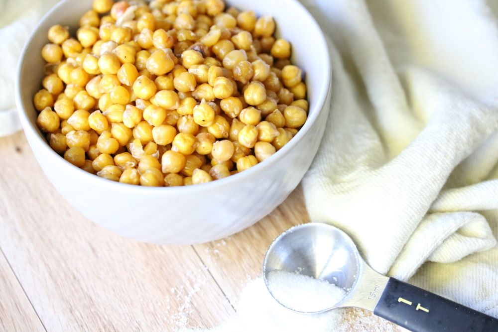 A four-ingredient, simple snack recipe perfect for kids and adults. these gluten-free, vegan chickpeas make a tasty snack for long car rides or hiking.