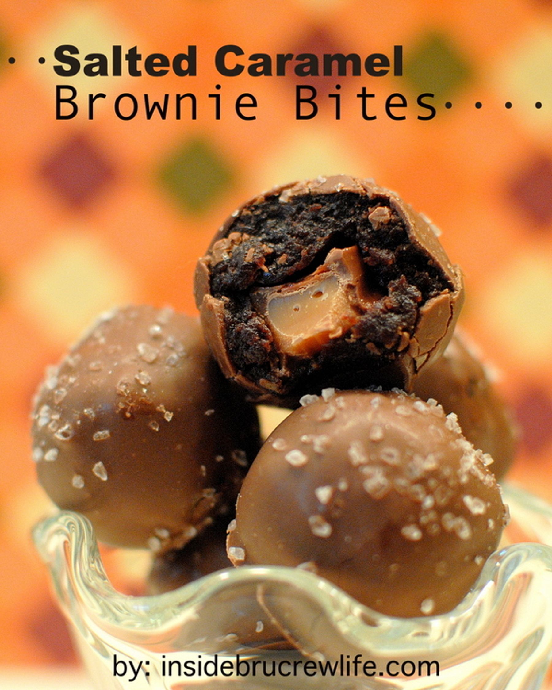 Brownie bites wrapped around a caramel candy and dipped in chocolate.