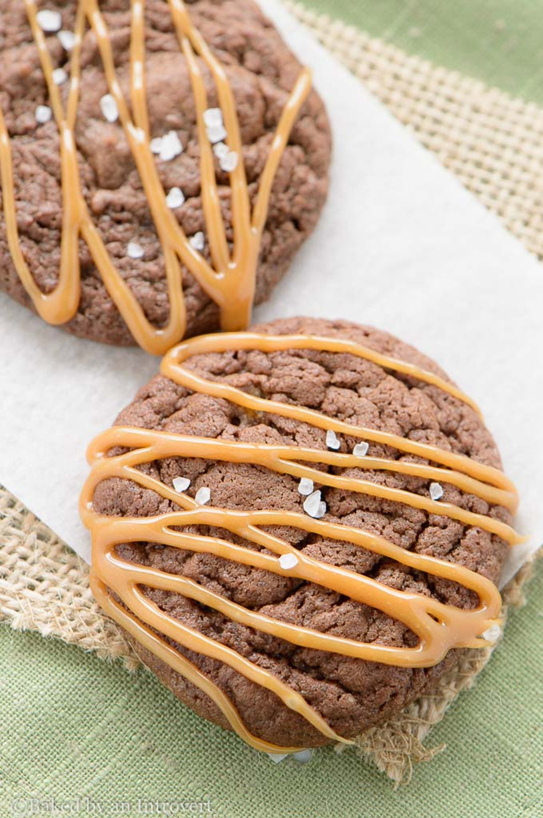 Decadent fudge chocolate brownie cookies topped with caramel and a sprinkle of sea salt.