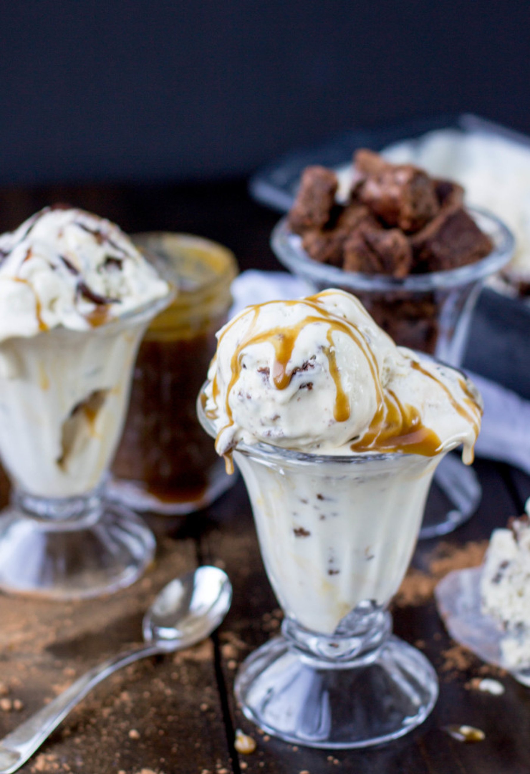 Sweet, no-churn, egg-free, no ice-cream-maker-required Salted Caramel Ice Cream loaded with fudgy brownie bits.