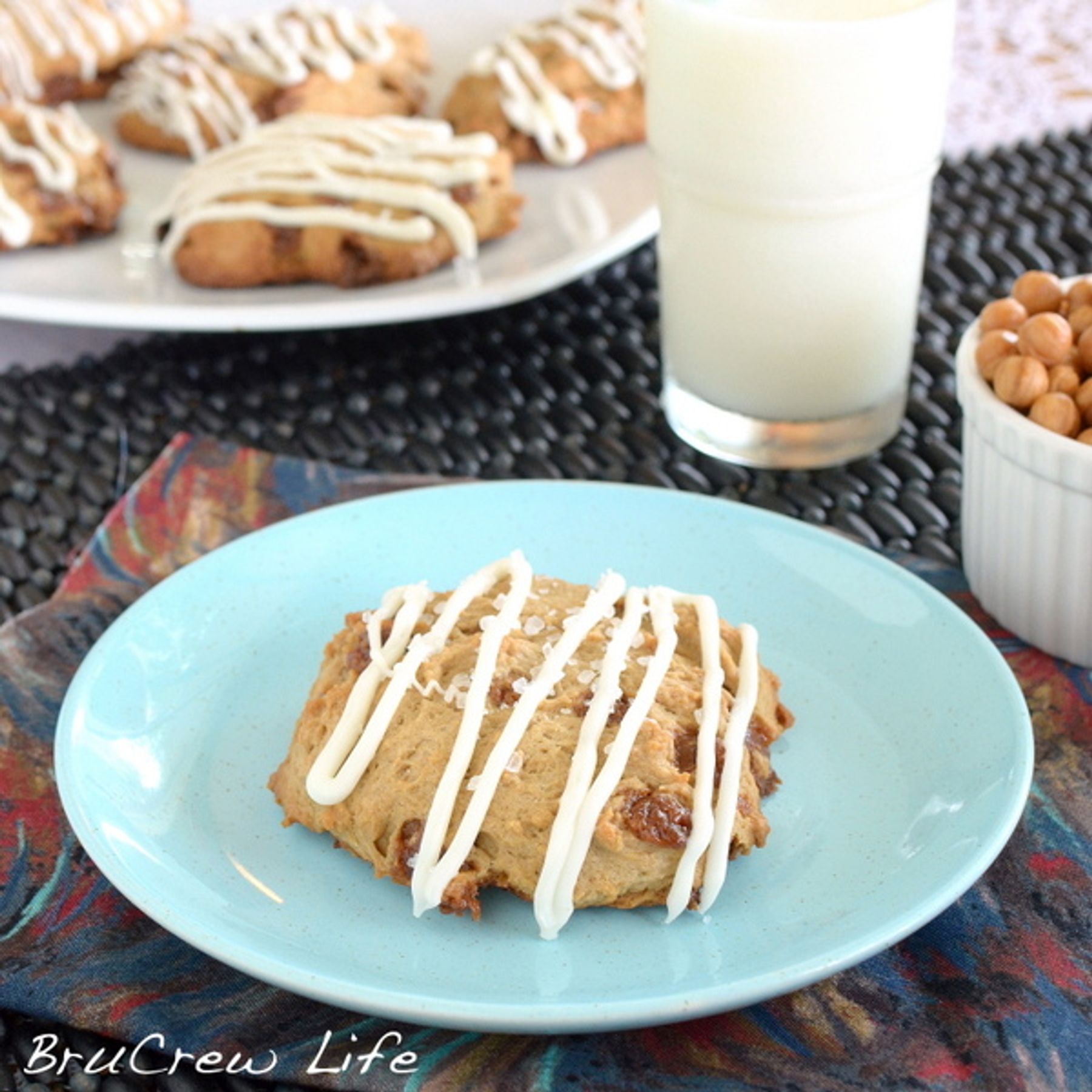 Soft flakey caramel coffee scones topped with white chocolate and sea salt