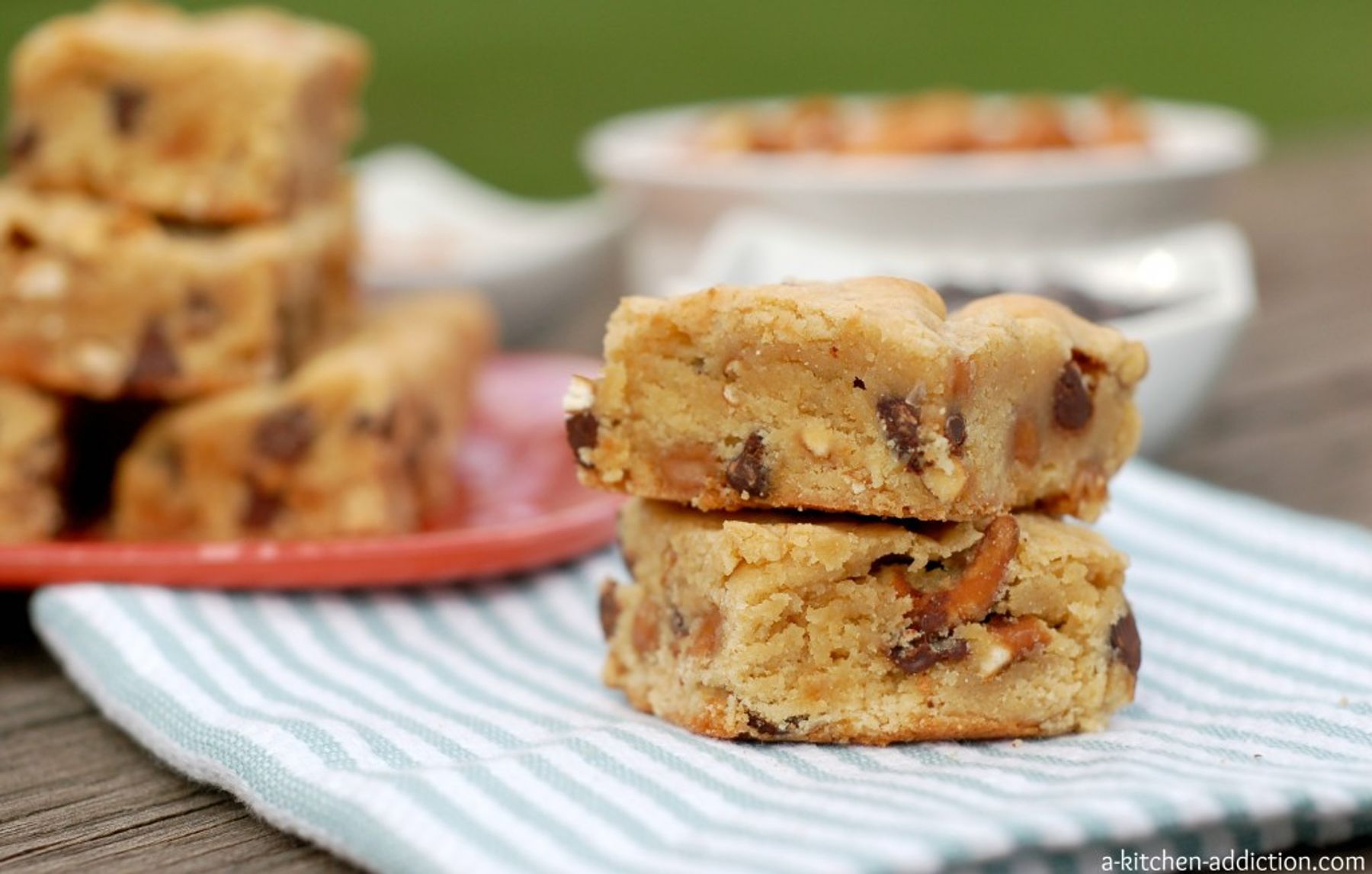 When I originally had this sweet and salty combination in my head, I couldn’t decide if I should make granola bars or blondies. I settled on granola bars, because I wanted to have something somewhat healthy to snack on in the house. However, as soon as I tasted the chocolate caramel pretzel granola bars, I knew that I had to use this combination in blondies.