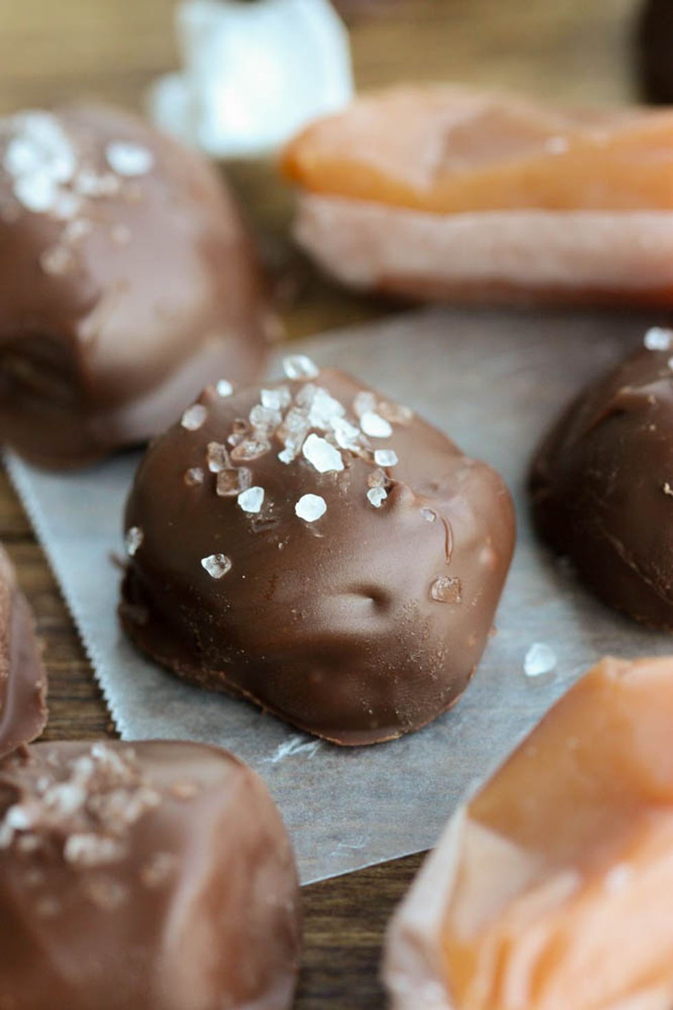 Soft homemade caramels covered in chocolate and sprinkled with sea salt.