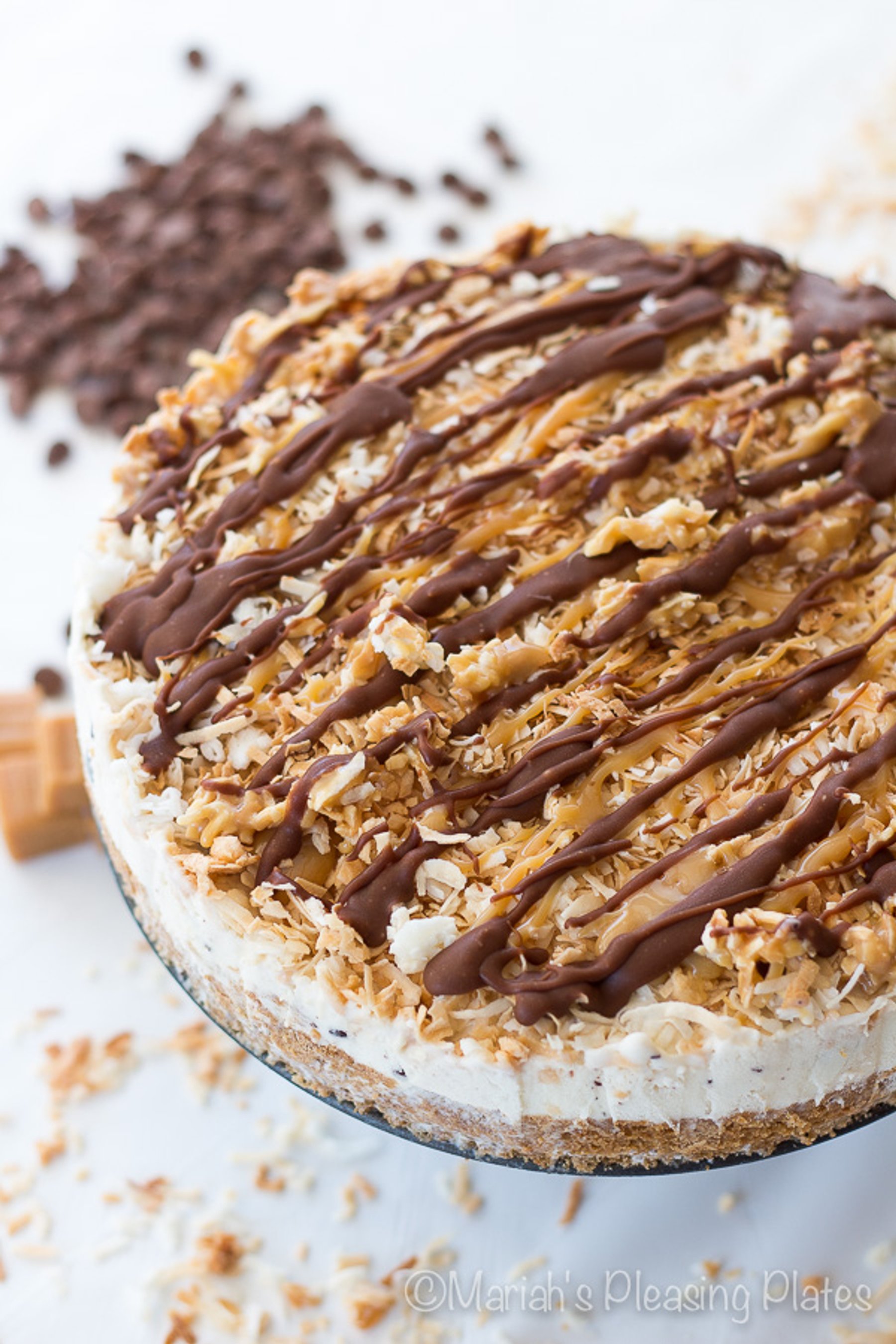 A sweet samoa ice cream cake that tastes just like the real thing. Chocolate ganache, toasted coconut, and vanilla ice cream make up this easy no bake treat.