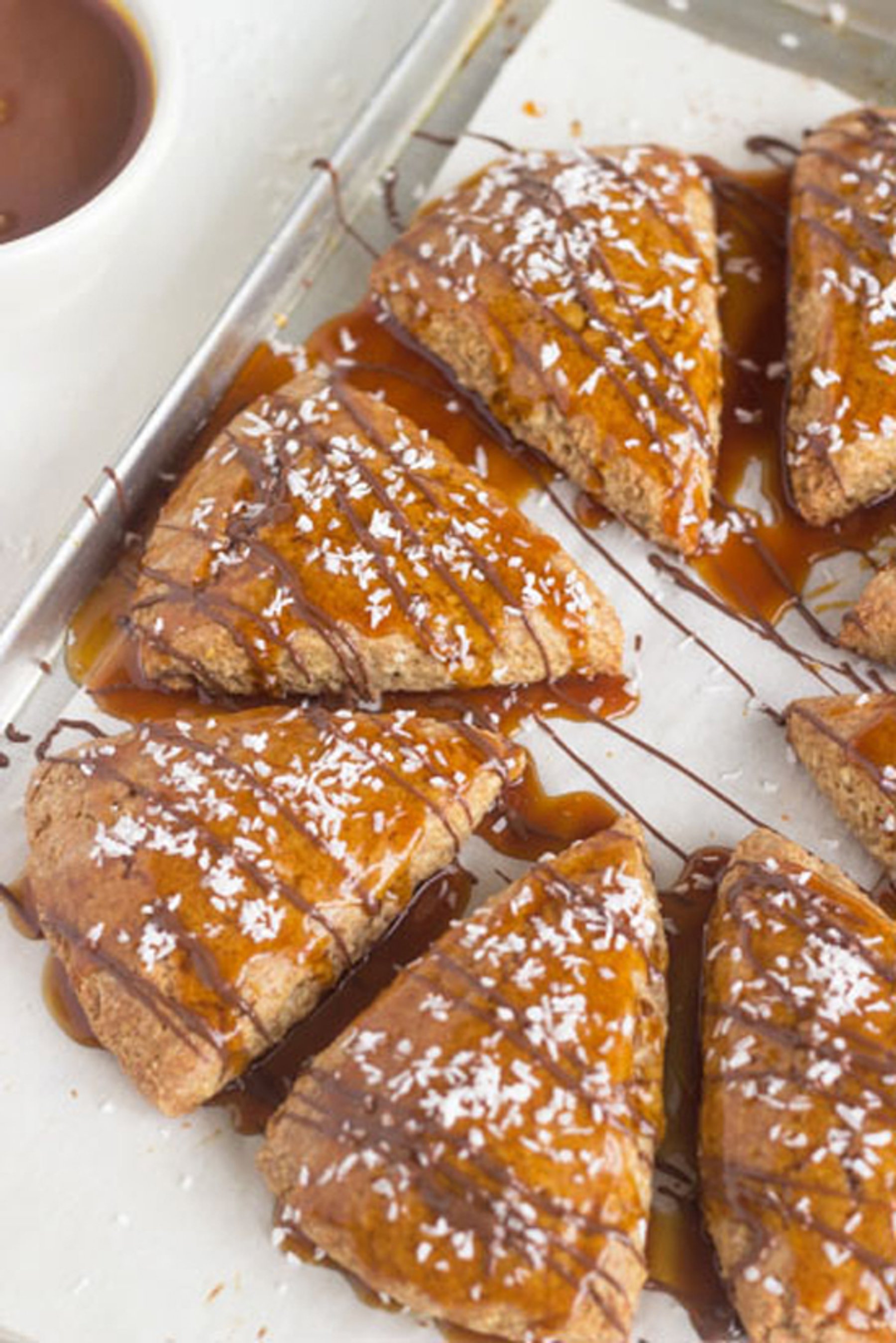 This is the best scone recipe! Loaded with chocolate, caramel and coconut, just like a Samoa Girl Scout Cookie, but healthy! You won’t be able to eats just one.