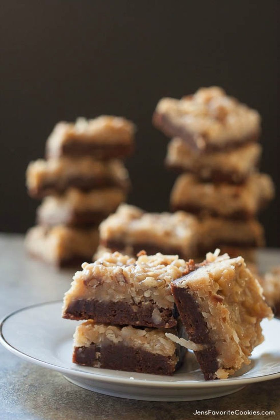 Rich chocolate brownies with a caramel coconut pecan topping.