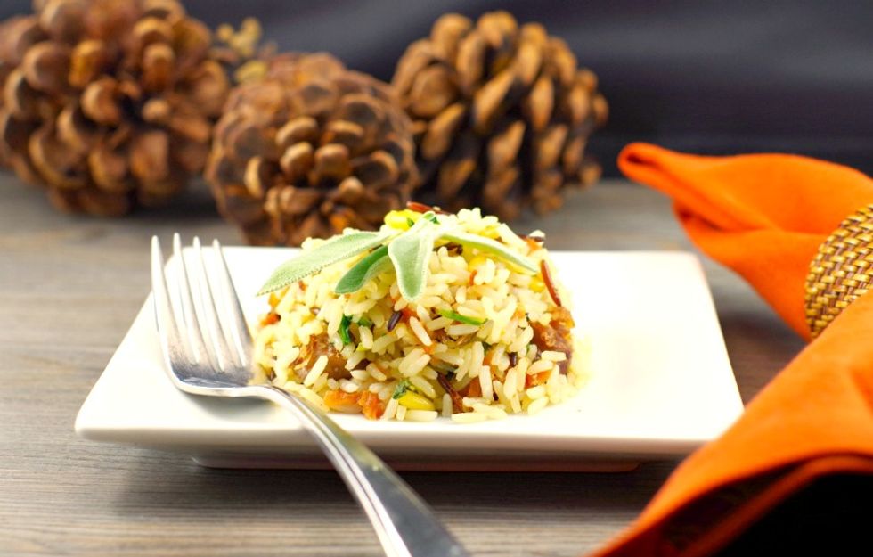 This Gluten-free Sausage & Apple Rice with dehydrated/dried apples, sage, wild rice, spinach and pine nuts is a great fall dish and perfect for a Thanksgiving or holiday side dish.