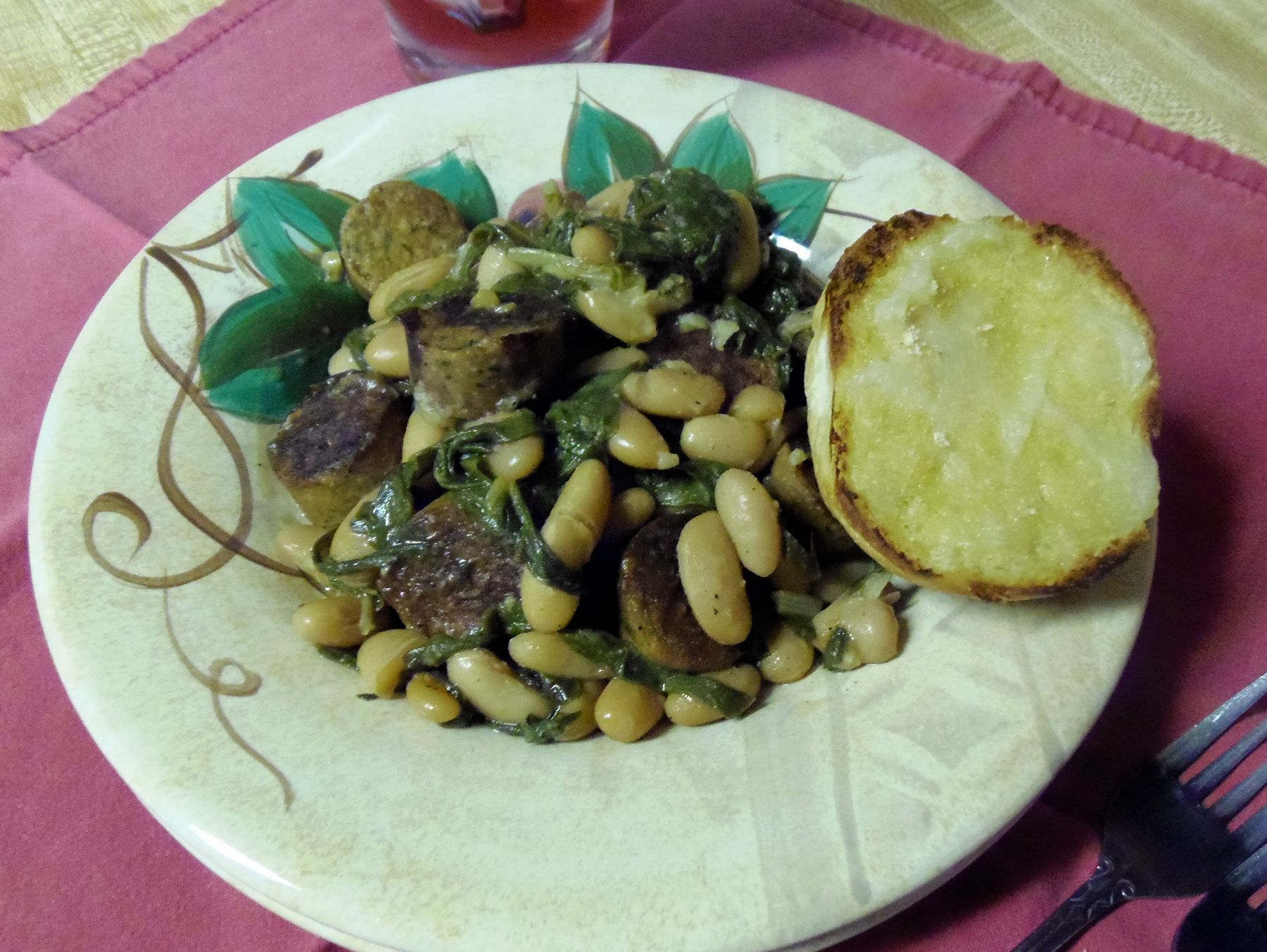 A fast and very flavorful dish of vegan sausages, beans and greens.