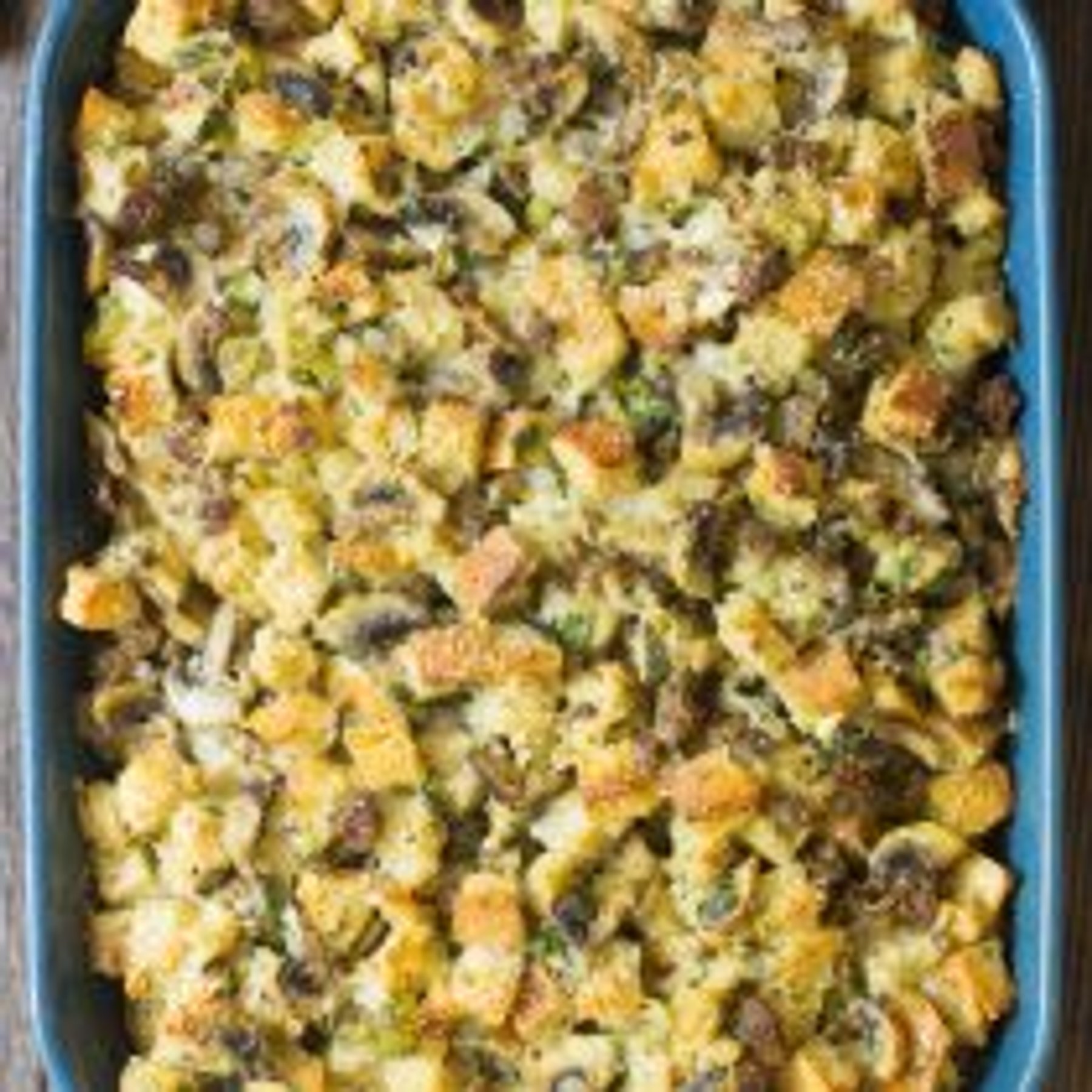 Sausage Mushroom Thanksgiving Stuffing Recipe - A fluffy and comforting bread dressing baked with zesty pork sausage and earthy mushrooms.