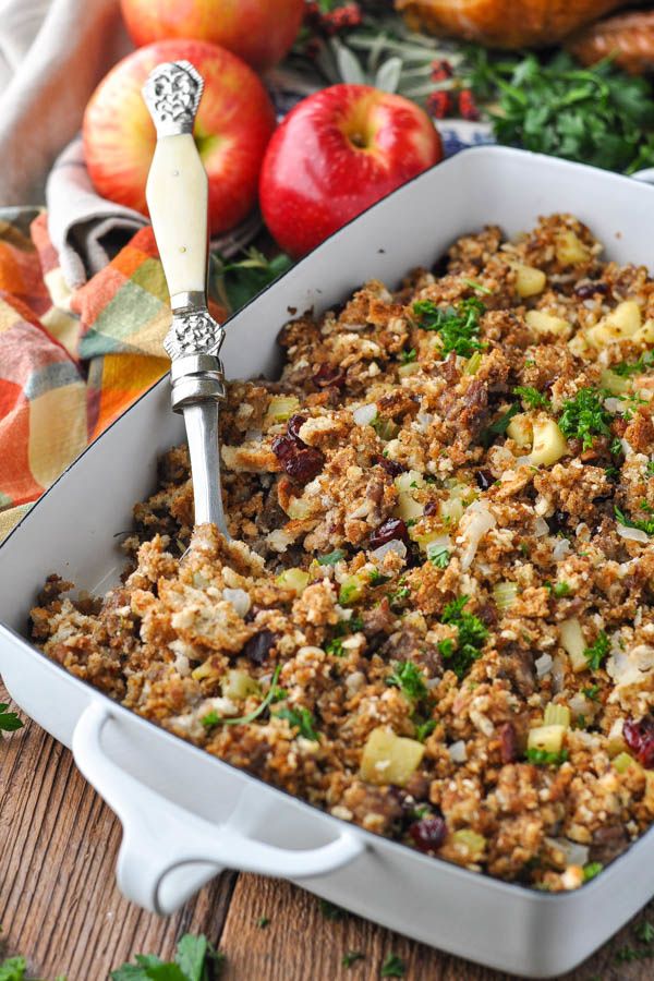 This easy Sausage Stuffing recipe is the ultimate holiday side, but you don't have to wait for Thanksgiving to enjoy the hearty homestyle dish. With help from store-bought stuffing mix, you can whip up a flavorful and moist stuffing that's loaded with sausage, apples, onion, celery, cranberries and plenty of herbs -- in about 20 minutes! The savory herb and apple sausage stuffing is a perfect companion for roasted turkey or chicken (and you can make it ahead of time).