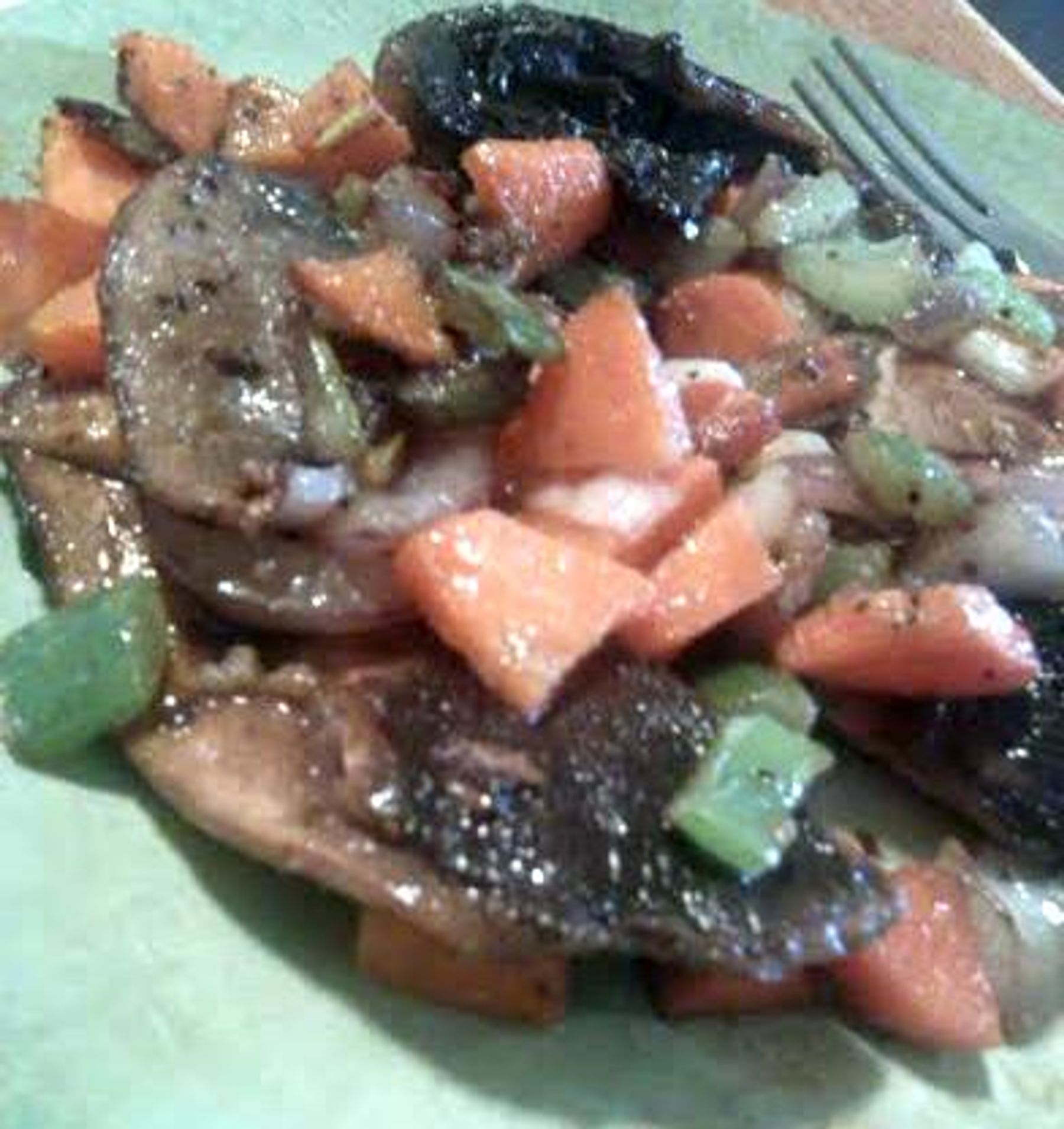 Add a tablespoon of oil to your skillet. Saute your diced vegetables. Remove. Add more oil and saute both sides of sliced portabella mushroom with soy sauce. You don't need to add salt as the soy sauce is salty enough for most people. Top your mushroom with veggies and enjoy.