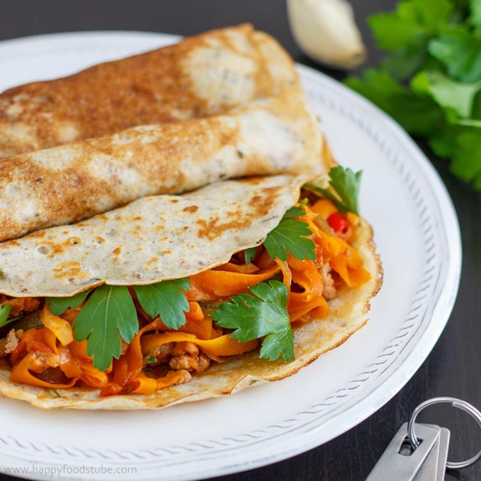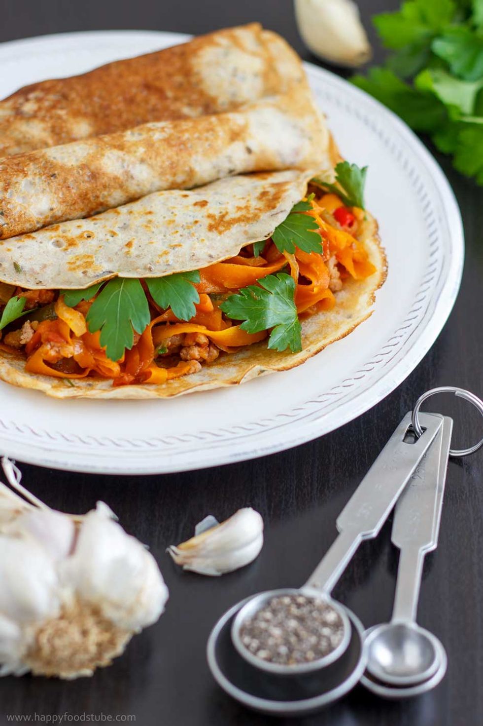 Have you ever tried savory filled crêpes? I don’t make them often but when I do I make mostly minced meat sauce (with canned tomatoes and other vegetables). This time I played with the batter too and created this tasty savory pancake/ crêpe batter with chia seeds and garlic. We loved them!