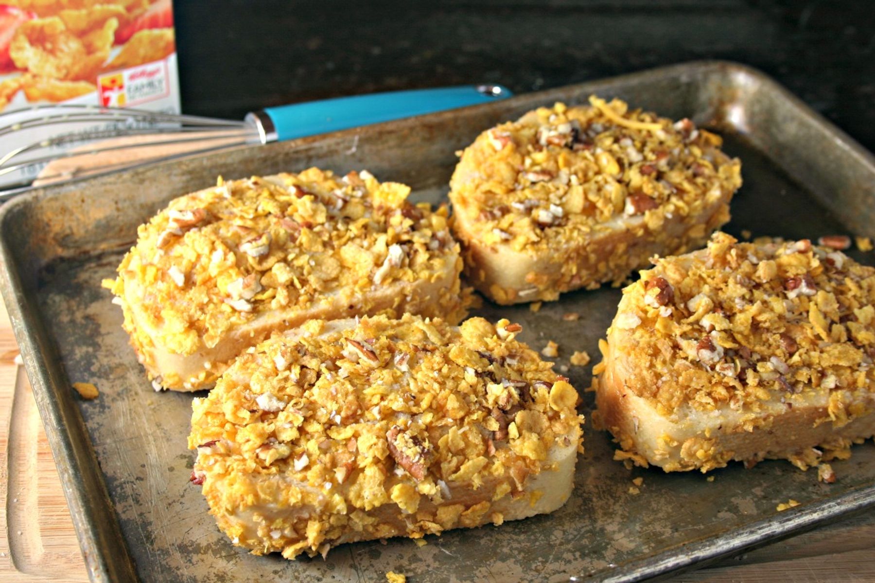 You\\\'ve never seen anything like this crunchy french toast recipe stuffed with cheese and coated with crunchy pecans and corn flakes!