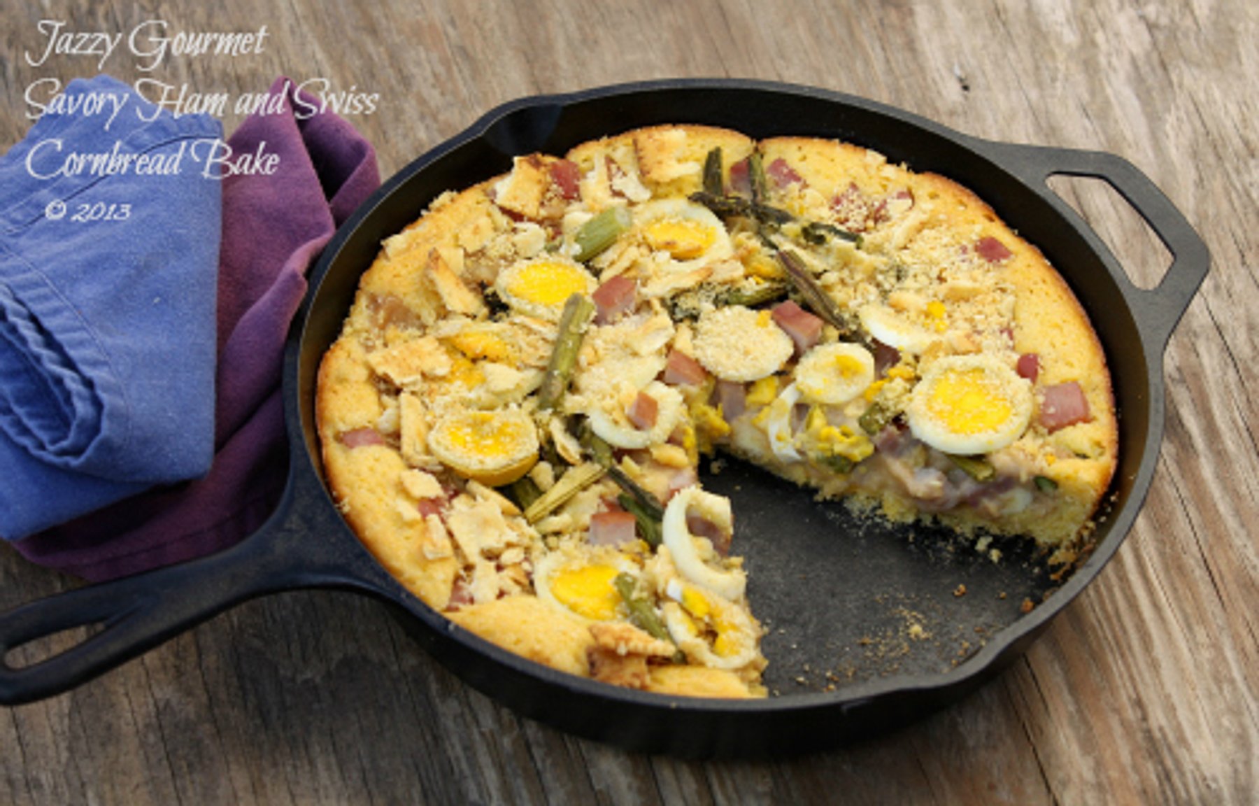 Salty chunks of ham, sweet/grassy bites of asparagus, and hard boiled eggs, smothered in a swiss cheese sauce on a cornbread crust, make a great skillet meal!