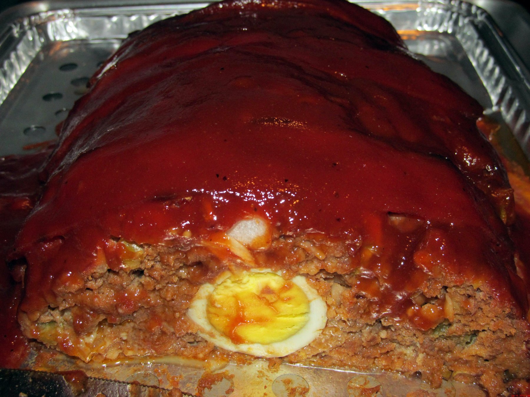 This meatloaf will not disappoint with sweet and savory flavorings throughout. It also has crushed butter crackers, McCormick meatloaf seasoning and boiled eggs down the middle with much more that make this meal delicious !