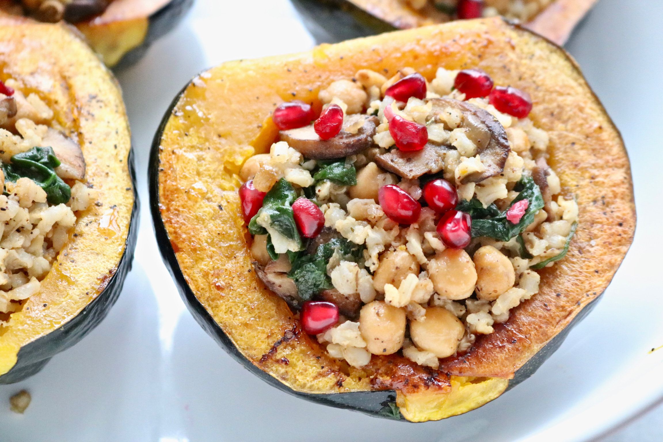 Healthy Savory vegetarian stuffed acorn squash full of protein, veggies, salty parmesan cheese, topped with tangy pomegranate seeds. Filled with brown rice mushrooms and chickpeas for a good dose of protein. Gluten-free, low fat and oh so good!!!