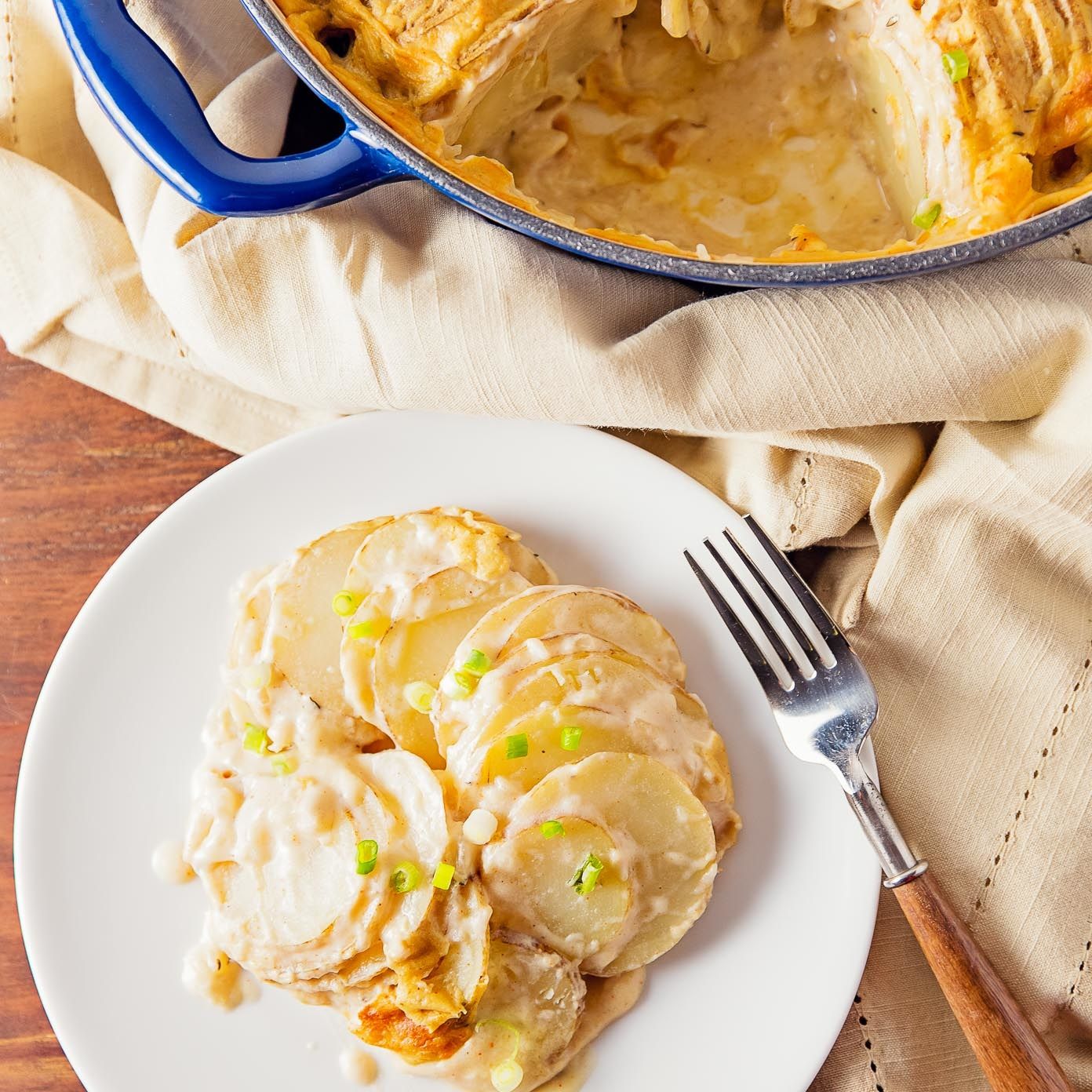 Creamy vegan Scalloped Potatoes made the healthy way. A creamy and delicious vegan, oil free, and gluten free dish!