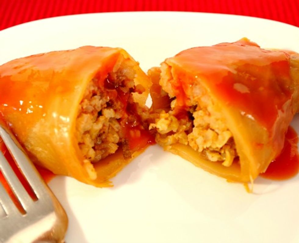 Hearty, meaty cabbage rolls, stuffed with ground beef, rice, mushrooms and smothered in a tomato sauce.