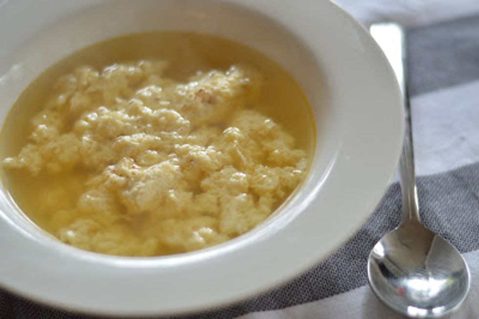 Heat broth over medium-high heat. Scramble eggs with cheese, nutmeg and pepper. When broth comes to a boil, lower the heat to a simmer and drizzle the eggs into the pot over a fork. As the eggs cook,...
