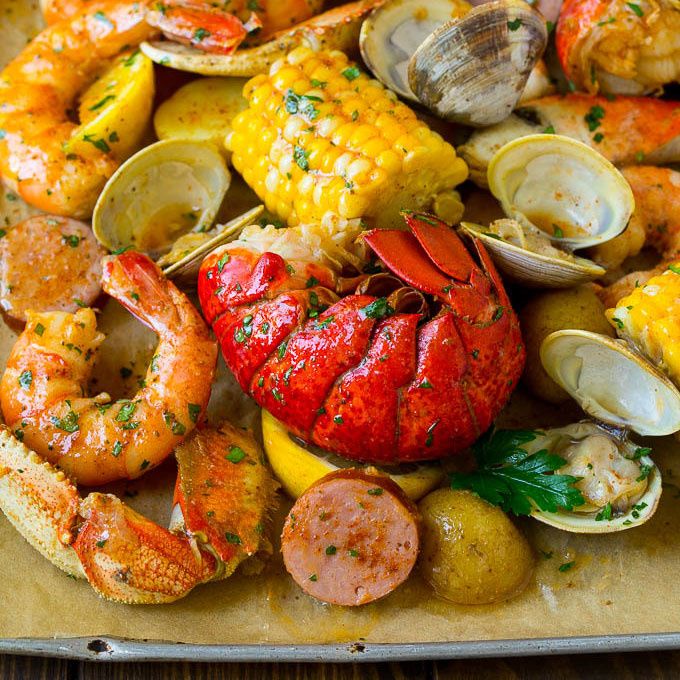 This seafood boil contains fresh shrimp, lobster, clams, crab, potatoes, corn and sausage, all boiled in a flavorful broth. An impressive meal in one pot that's perfect for feeding a crowd!