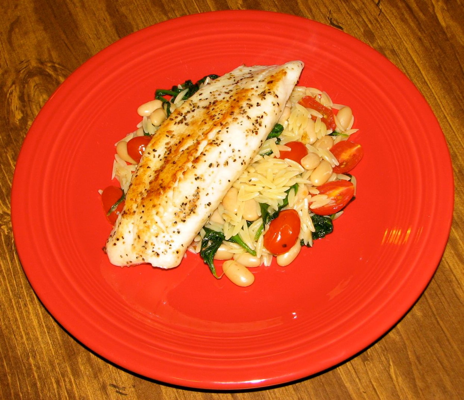 Cook the orzo according to the package directions, drain and set aside. While the pasta cooks sprinkle the tilapia with 1/4 t. salt and 1/4 t. pepper. Heat a large nonstick skillet over medium high heat...