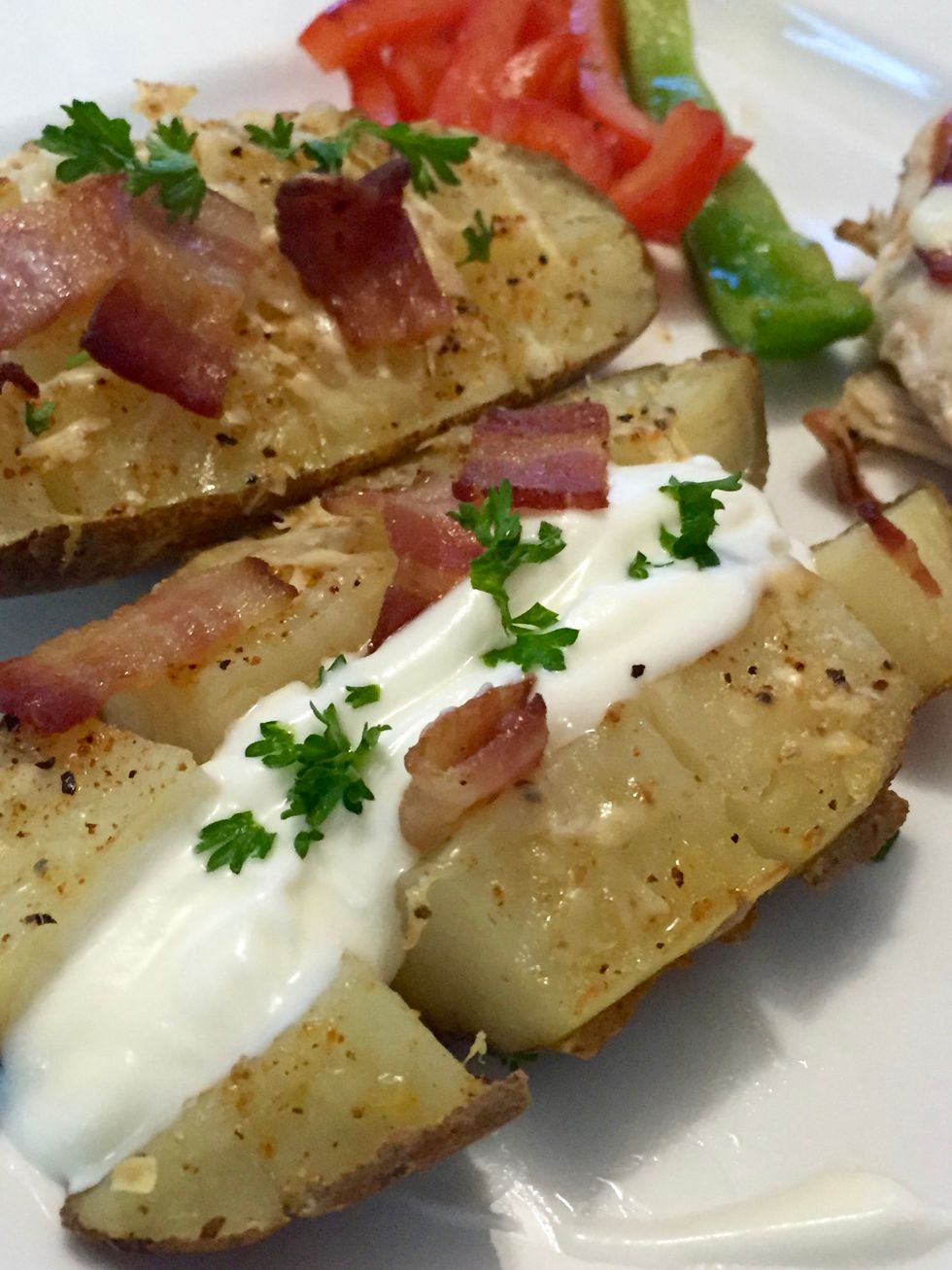 Preheat oven to 450. All you do is cook a pierced potato in the microwave until it’s soft all the way through – about 6-7 minutes total, flipping over every 1-2 minutes. Cut the potato in half, then cut...
