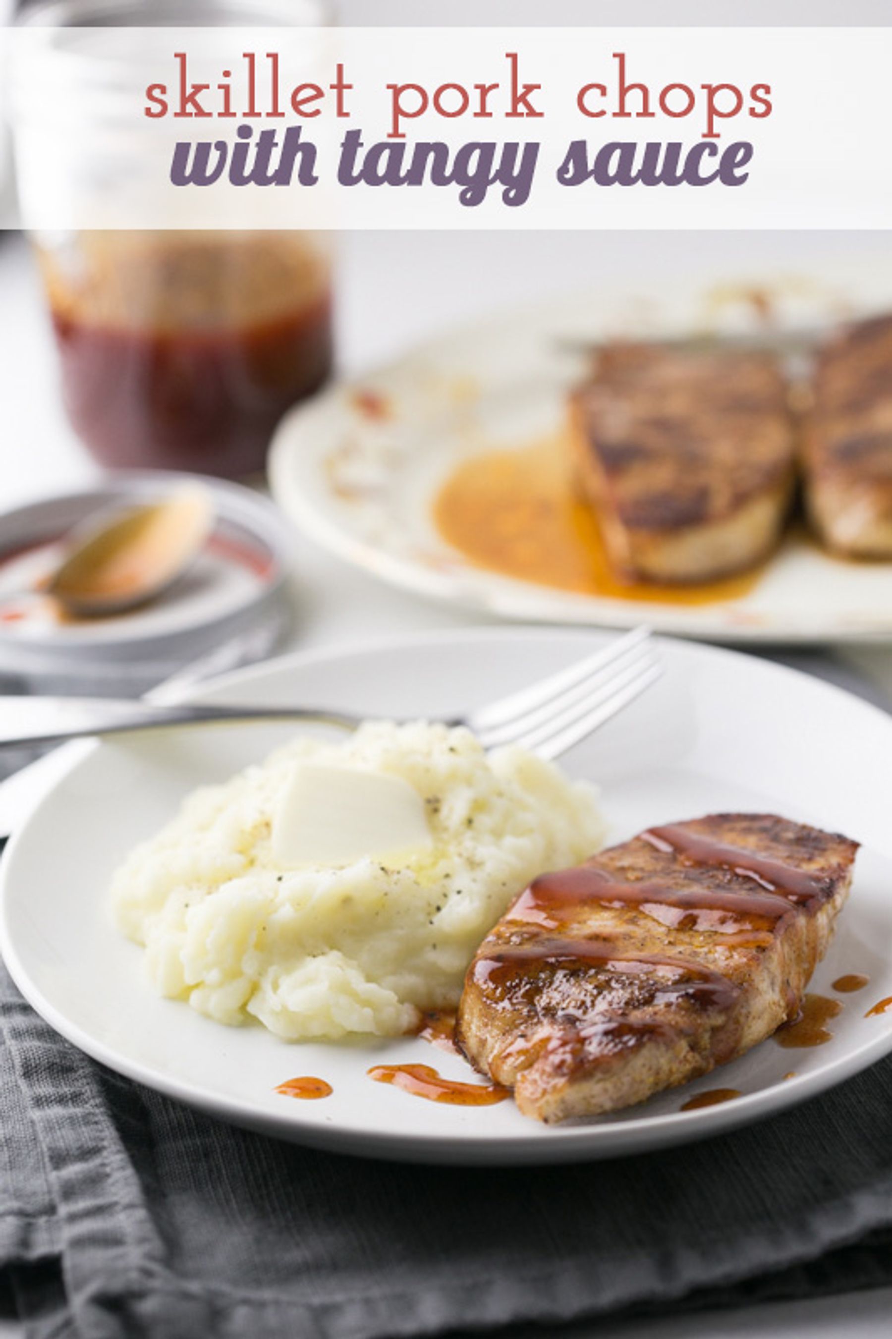 Seasoned skillet pork chops come together in less than half an hour for a delicious weeknight dinner! Tangy sauce is perfect on the side!