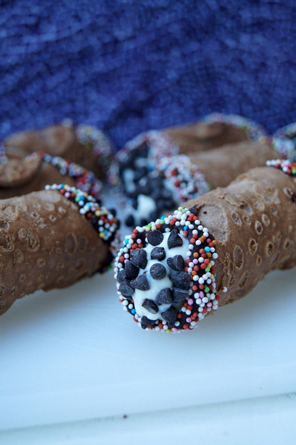 Semi-Homemade Cannoli: pre-made cannoli shells dipped in chocolate and sprinkles paired with a homemade classic ricotta based filling.