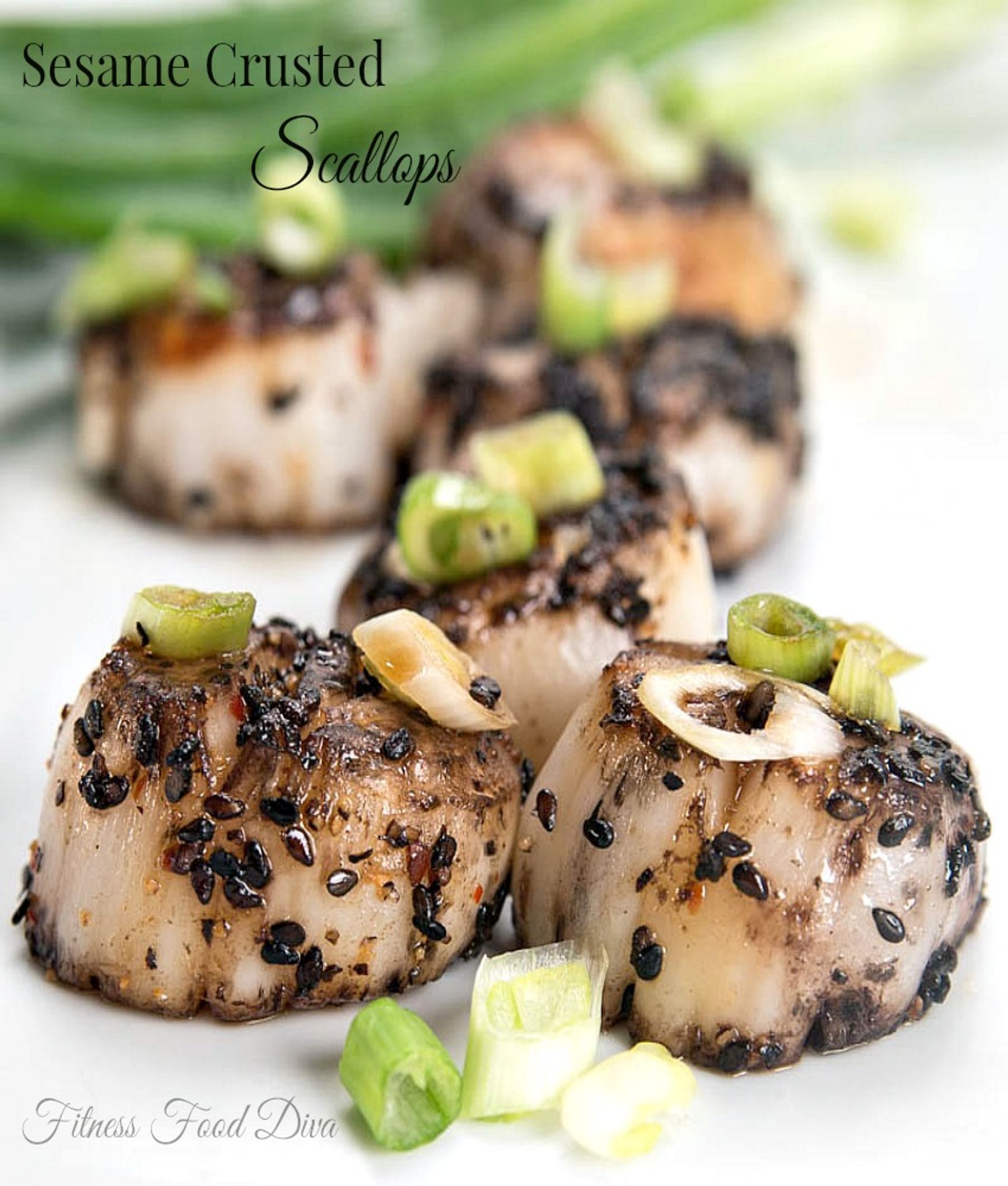 Place sesame seeds in a small bowl and dip both sides of scallops in sesame seeds.