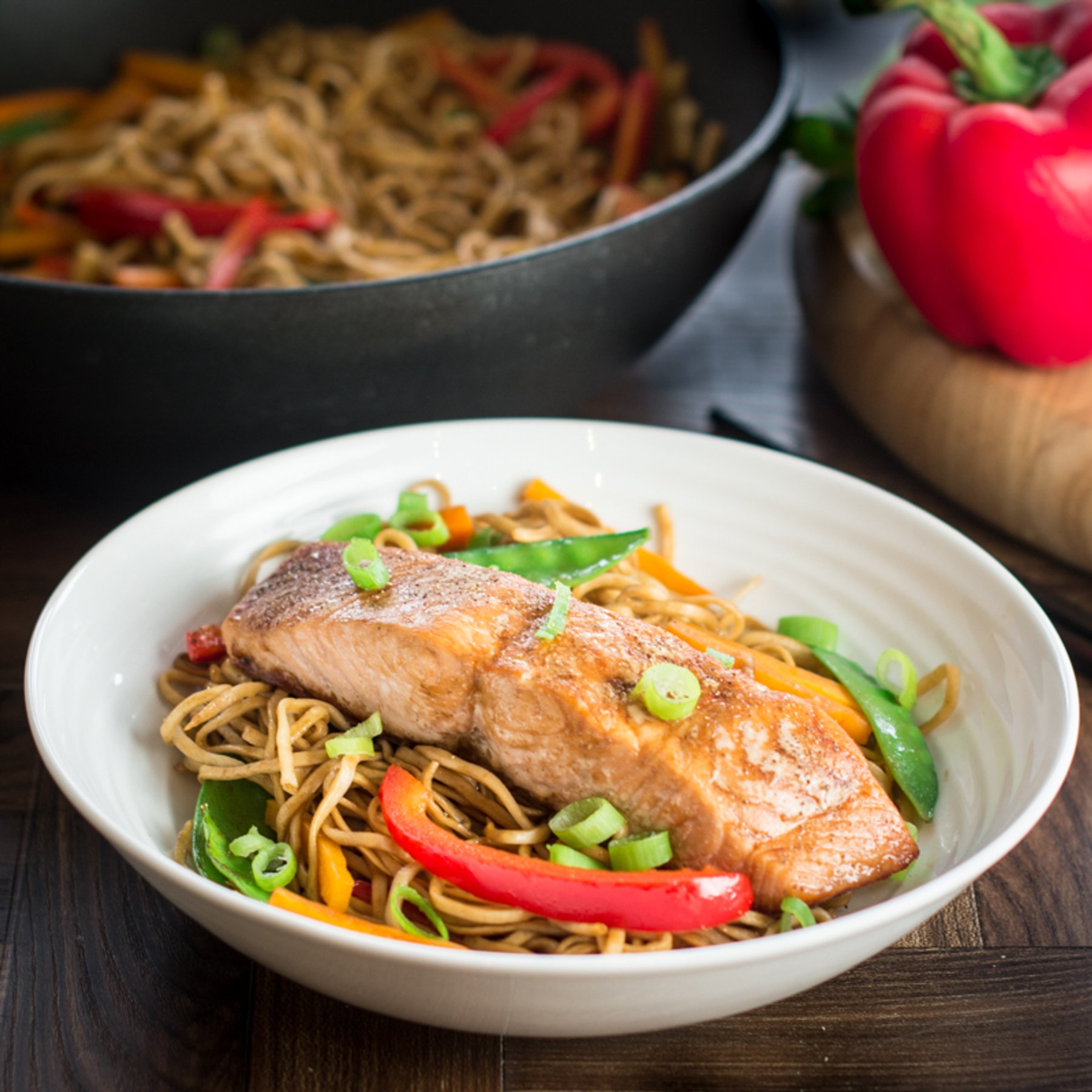 Soy and sesame marinated salmon served with a delicious vegetable chow mien. A quick and healthy midweek dinner.