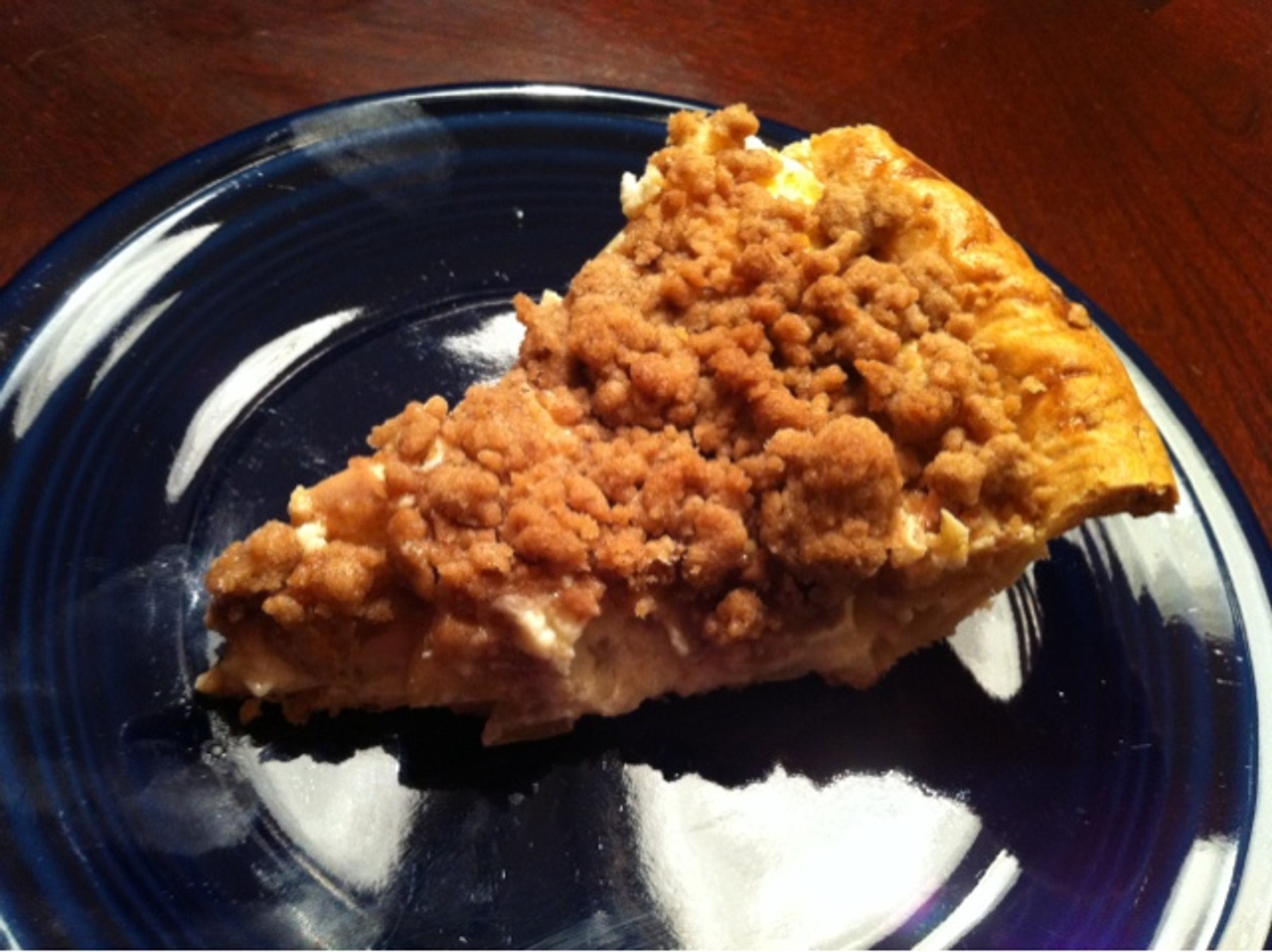 Preheat oven at 400. Mix together the sour cream, eggs, sugar, two tablespoons flour and vanilla. Add in apples and pour into pie crust. Bake for 25 minutes. While that’s baking, combine the brown sugar,...