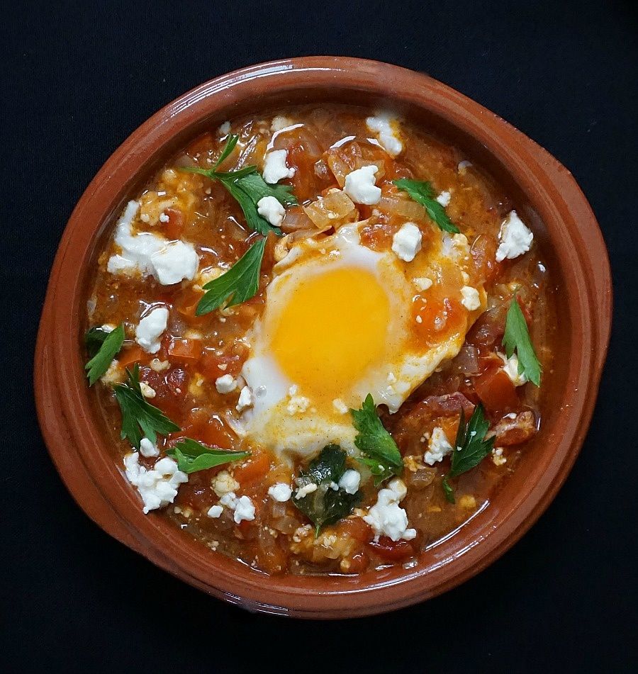 Shakshuka is a dish with deep roots in Arabian and Mediterranean cuisine. It is quite simply eggs poached in a fragrant sauce of tomatoes peppers and spiced according to regional preferences.