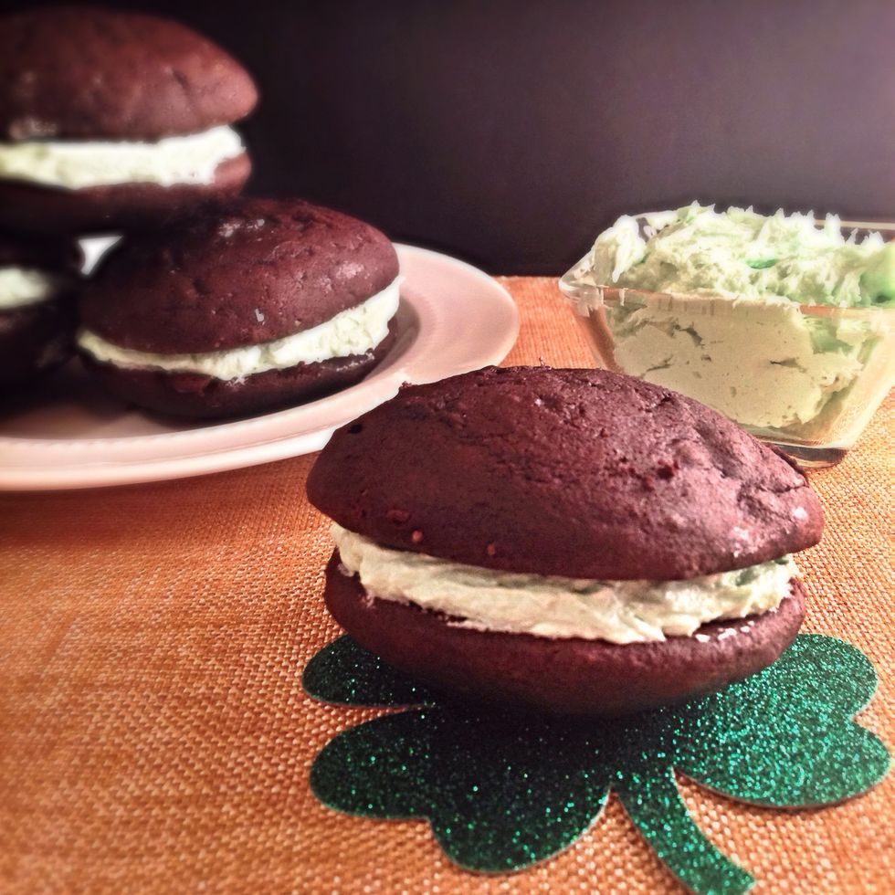 Two dark chocolate cake discs filled with a minty fluff filling! The perfect dessert for St. Patrick's Day!