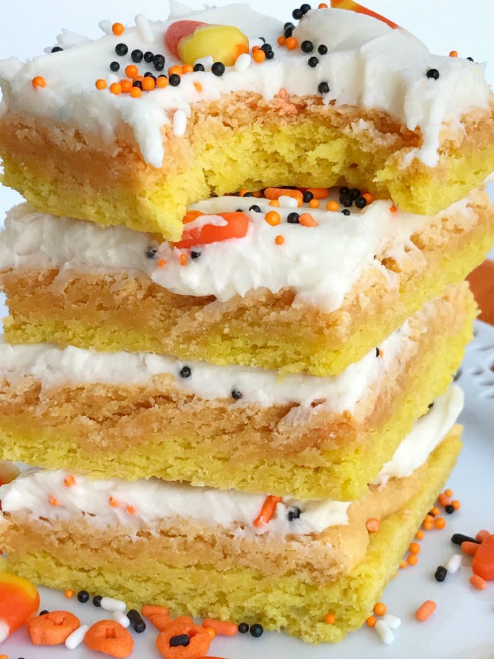 Candy corn sugar cookie bars are the best way to celebrate Halloween. Sugar cookie bars made in a sheet pan so there is plenty for everyone. Layered in yellow & orange sugar cookies and then topped with a white cream cheese icing and decorated with candy corn and Halloween sprinkles! These are so addictive and will be the hit of any party.